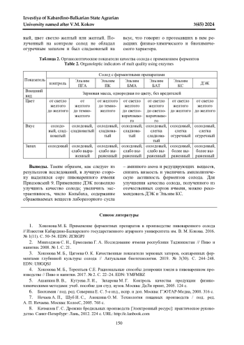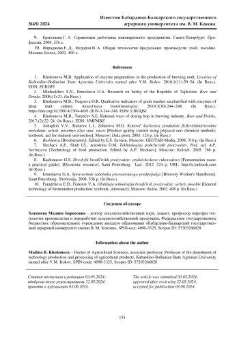 1. 	Хоконова М. Б. Применение ферментных препаратов в производстве пивоваренного солода // Известия Кабардино-Балкарского государственного аграрного университета им. В. М. Кокова. 2016. № 1(11). С. 50-54. EDN: ZCRGPJ