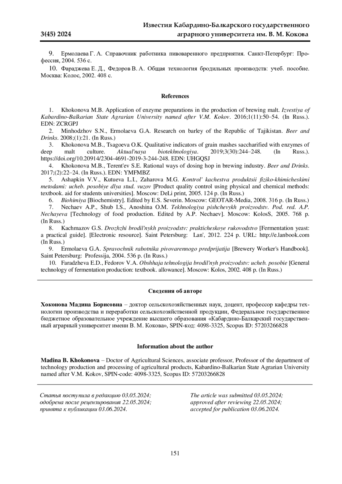 3. 	Хоконова М. Б., Цагоева О. К. Качественные показатели зерновых заторов, осахаренных ферментами глубинной культуры солода // Актуальная биотехнология. 2019. № 3(30). С. 244-248. EDN: UHGQSJ