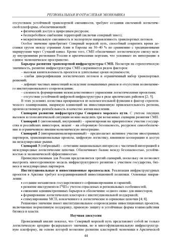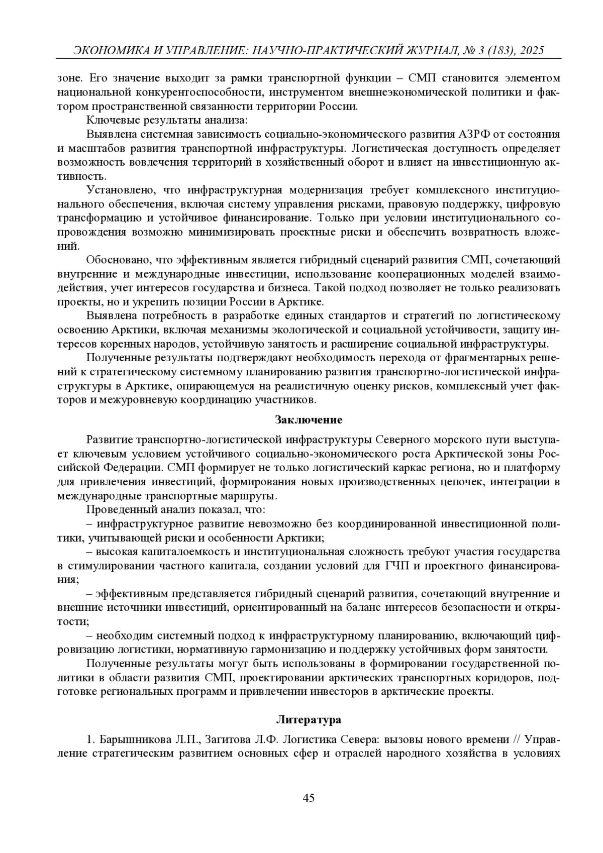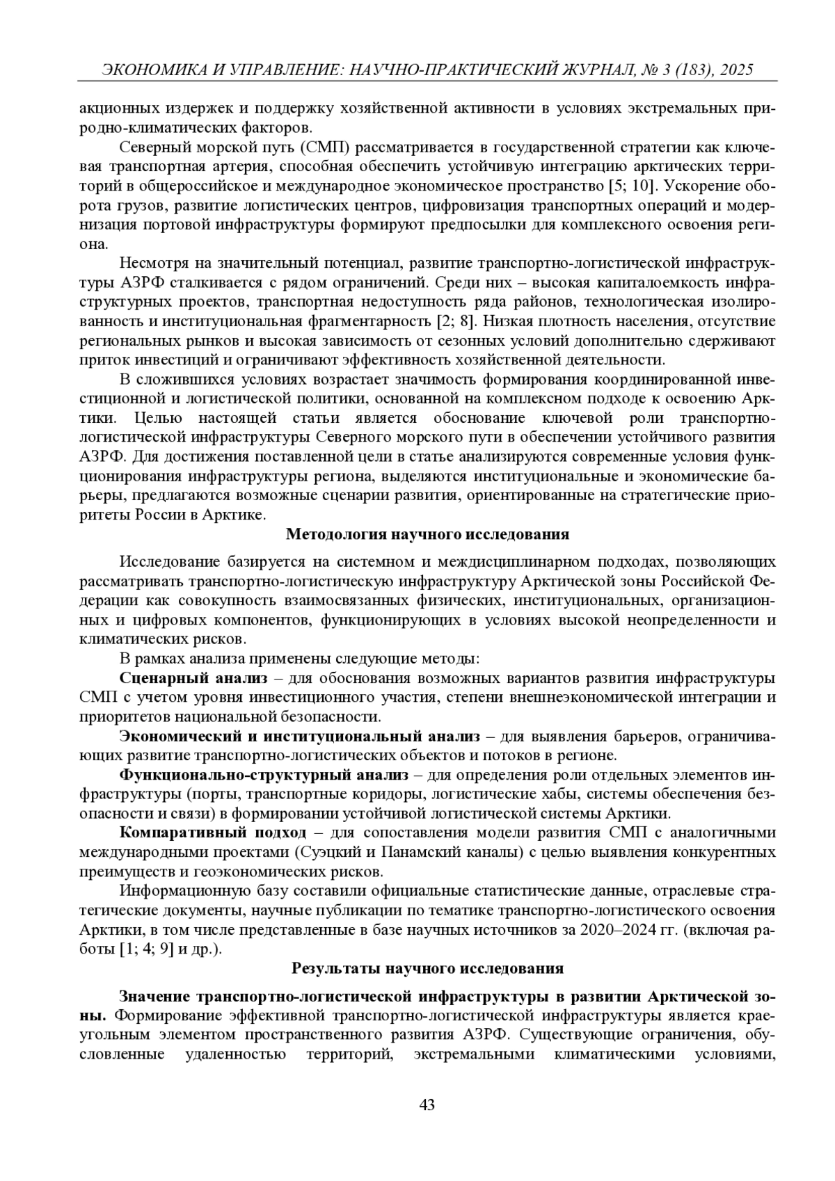Развитие Арктической зоны Российской Федерации (АЗРФ) предполагает формирование устойчивой транспортно-логистической инфраструктуры как системообразующего фактора социальноэкономического роста. Северный морской путь (СМП), выступая ключевой транзитной магистралью, значительно повышает связанность территорий, снижает логистические издержки и формирует инвестиционно привлекательное пространство. В статье рассмотрены ключевые проблемы и ограничения развития транспортной инфраструктуры АЗРФ, проанализированы возможные сценарии ее трансформации с учетом стратегических приоритетов, инвестиционной политики и геополитических факторов. Обосновывается роль СМП как точки роста и инфраструктурного ядра, вокруг которого может формироваться экосистема устойчивого развития с участием государства, бизнеса и международных партнеров. Предложены направления совершенствования инвестиционного климата, поддержка малых и средних предприятий, институциональное сопровождение логистических проектов в Арктике