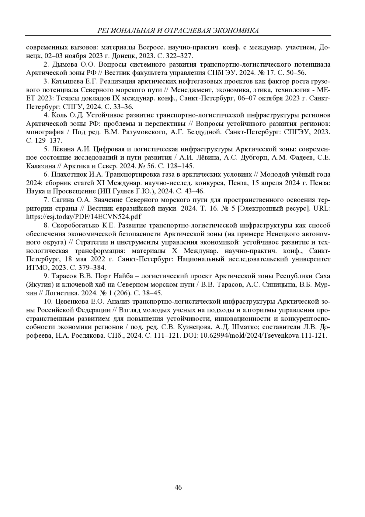10. 	Цевенкова Е.О. Анализ транспортно-логистической инфраструктуры Арктической зоны Российской Федерации // Взгляд молодых ученых на подходы и алгоритмы управления пространственным развитием для повышения устойчивости, инновационности и конкурентоспособности экономики регионов / под. ред. С.В. Кузнецова, А.Д. Шматко; составители Л.В. Дорофеева, Н.А. Рослякова. СПб., 2024. С. 111-121.  DOI: 10.62994/mold/2024/Tsevenkova.111-121  EDN: EYUDHB