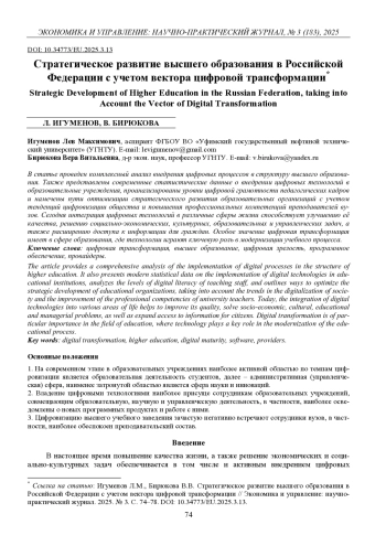 В статье проведен комплексный анализ внедрения цифровых процессов в структуру высшего образования. Также представлены современные статистические данные о внедрении цифровых технологий в образовательные учреждения, проанализированы уровни цифровой грамотности педагогических кадров и намечены пути оптимизации стратегического развития образовательных организаций с учетом тенденций цифровизации общества и повышения профессиональных компетенций преподавателей вузов. Сегодня интеграция цифровых технологий в различные сферы жизни способствует улучшению её качества, решению социально-экономических, культурных, образовательных и управленческих задач, а также расширению доступа к информации для граждан. Особое значение цифровая трансформация имеет в сфере образования, где технологии играют ключевую роль в модернизации учебного процесса