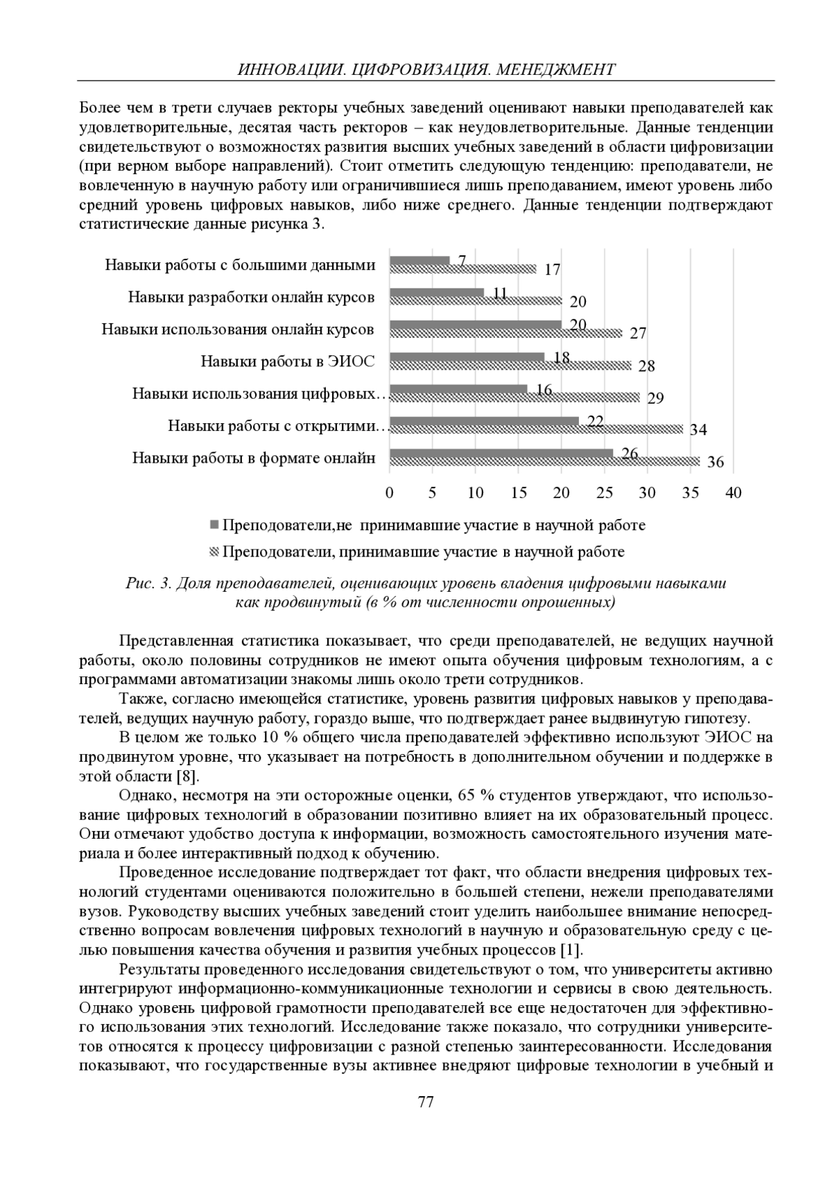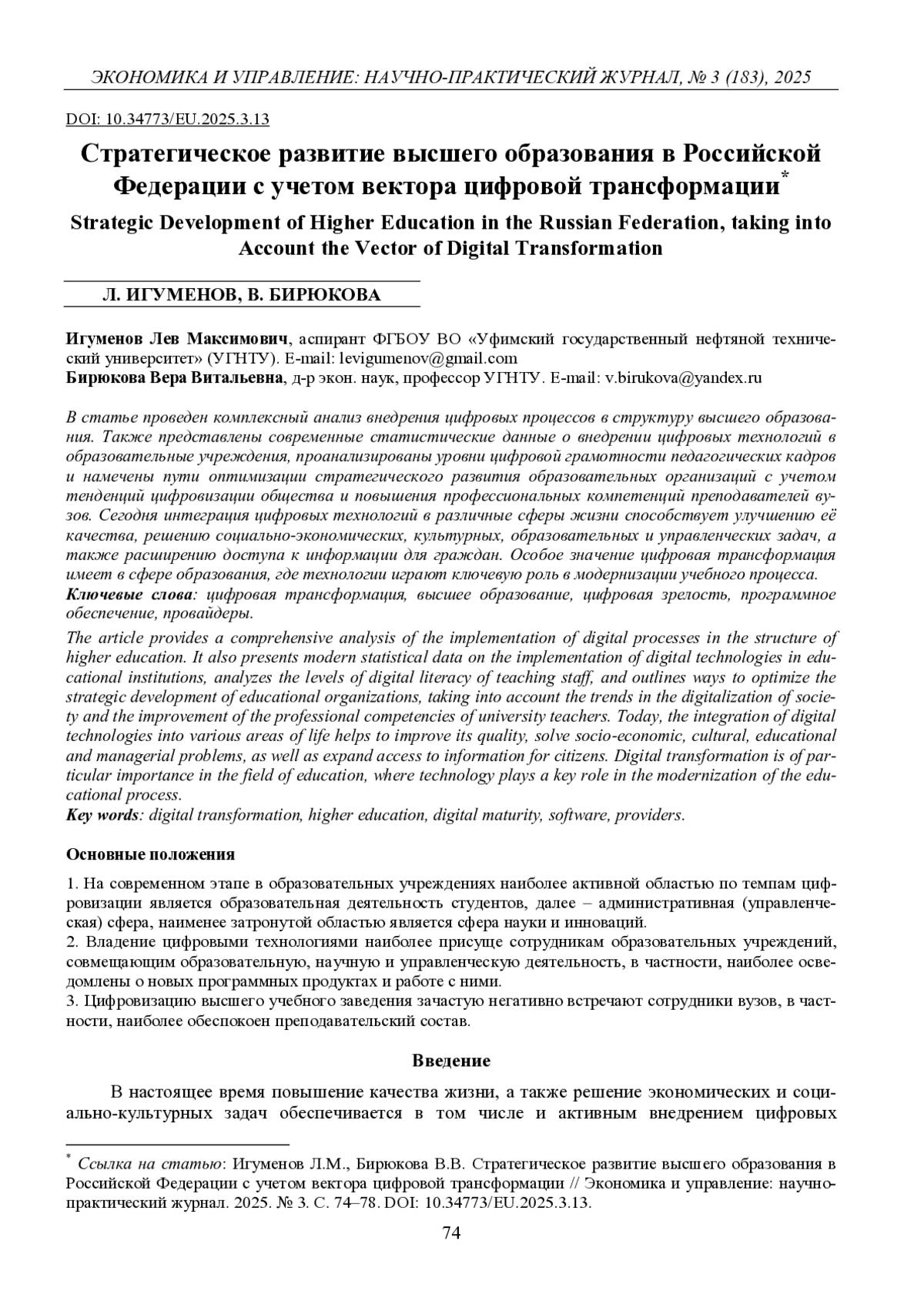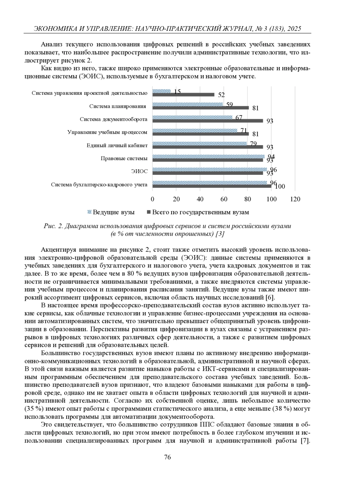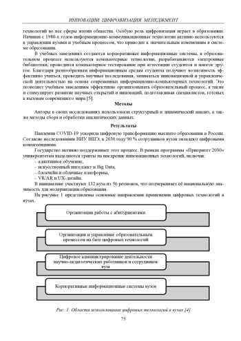 В настоящее время повышение качества жизни, а также решение экономических и социально-культурных задач обеспечивается в том числе и активным внедрением цифровых технологий во все сферы жизни общества. Особую роль цифровизация играет в образовании. Начиная с 1980-х годов информационно-коммуникационные технологии активно используются в управлении вузами и учебным процессом, что приводит к значительным изменениям в системе образования