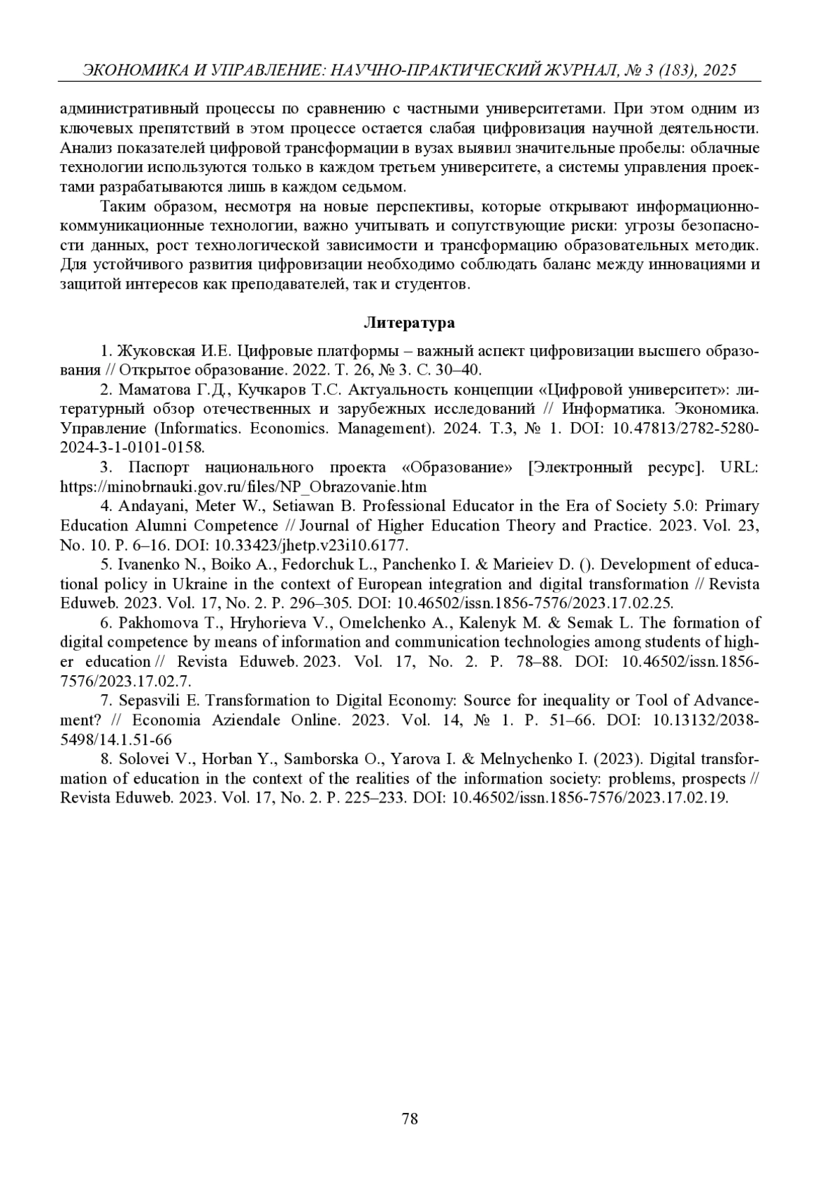 2. 	Маматова Г.Д., Кучкаров Т.С. Актуальность концепции “Цифровой университет”: литературный обзор отечественных и зарубежных исследований // Информатика. Экономика. Управление (Informatics. Economics. Management). 2024. Т.3, № 1.  DOI: 10.47813/2782-5280-2024-3-1-0101-0158