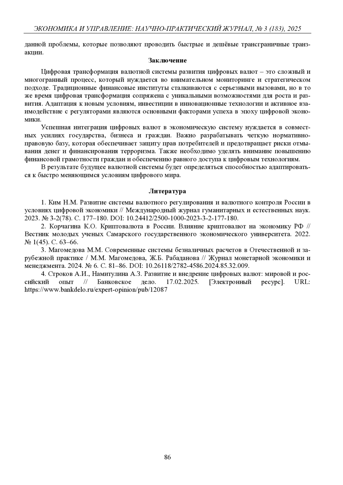 4. Строков А.И., Намитулина А.З. Развитие и внедрение цифровых валют: мировой и российский опыт // Банковское дело. 17.02.2025. [Электронный ресурс]. URL: https://www.bankdelo.ru/expert-opinion/pub/12087.