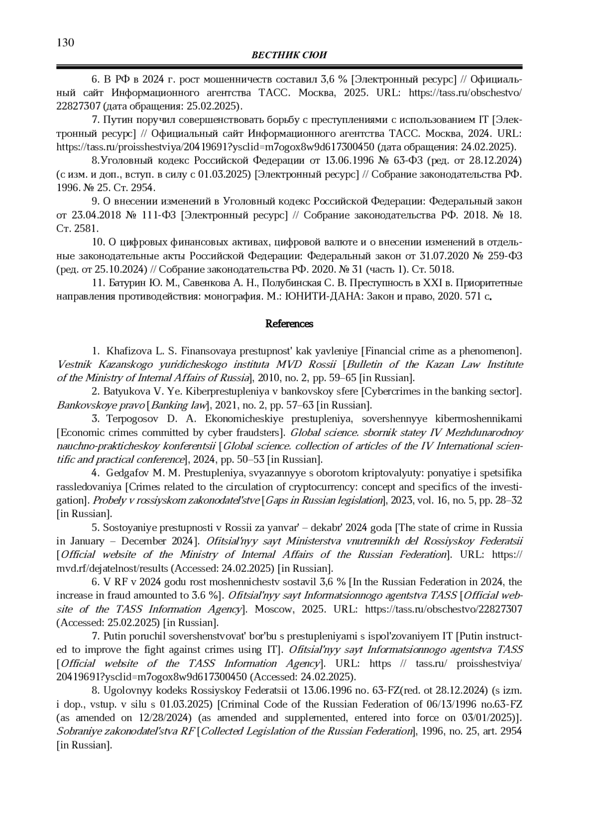 2. 	Батюкова В. Е. Киберпреступления в банковской сфере // Банковское право. 2021. № 2. С. 57-63. EDN: WKQCJX