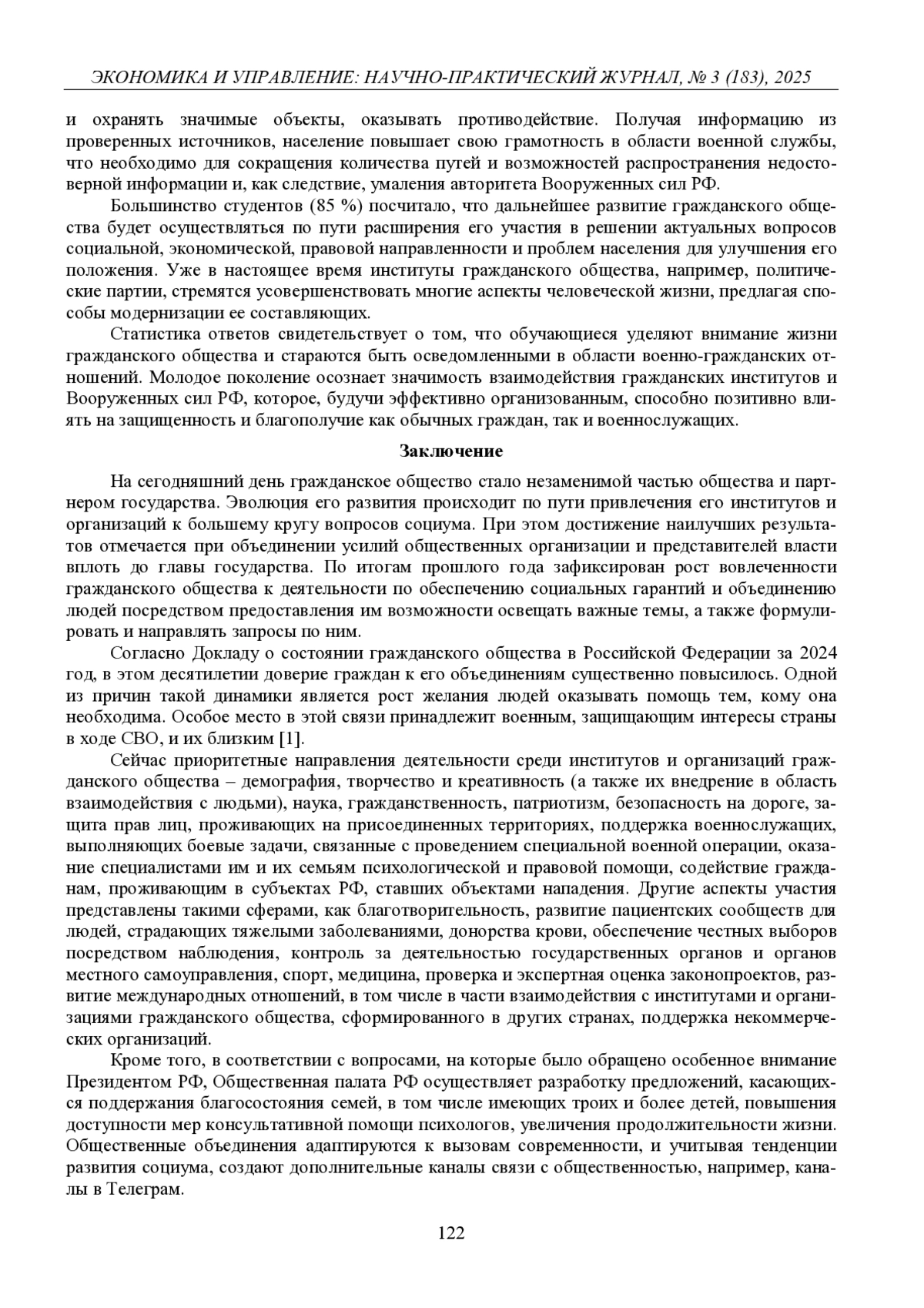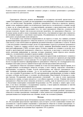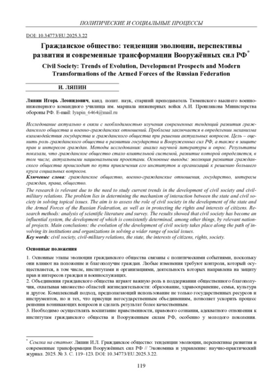 Исследование актуально в связи с необходимостью изучения современных тенденций развития гражданского общества и военно-гражданских отношений. Проблема заключается в определении механизма взаимодействия государства и гражданского общества при решении актуальных вопросов. Цель – оценить роль гражданского общества в развитии государства и Вооруженных сил РФ, а также в защите прав и интересов граждан. Методы исследования: анализ научной литературы и опрос. Результаты показали, что гражданское общество стало влиятельной системой, развитие которой определяется, в том числе, актуальными национальными проектами. Основные выводы: эволюция развития гражданского общества происходит по пути привлечения его институтов и организаций к решению большего круга социальных вопросов