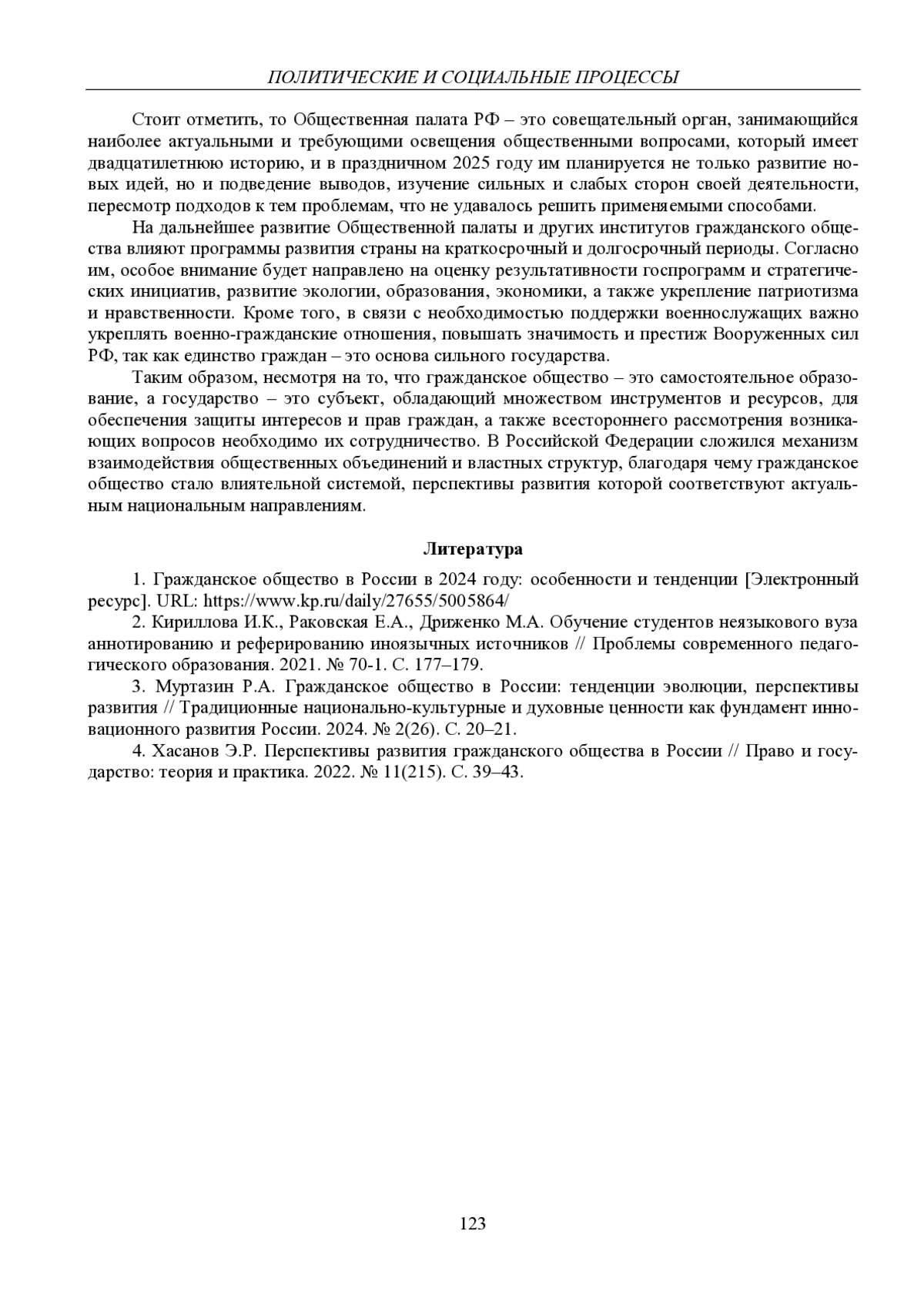 4. 	Хасанов Э.Р. Перспективы развития гражданского общества в России // Право и государство: теория и практика. 2022. № 11(215). С. 39-43