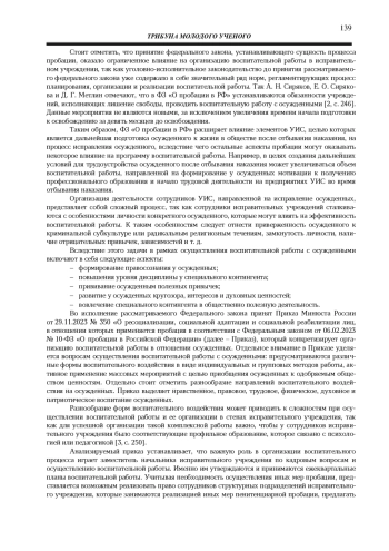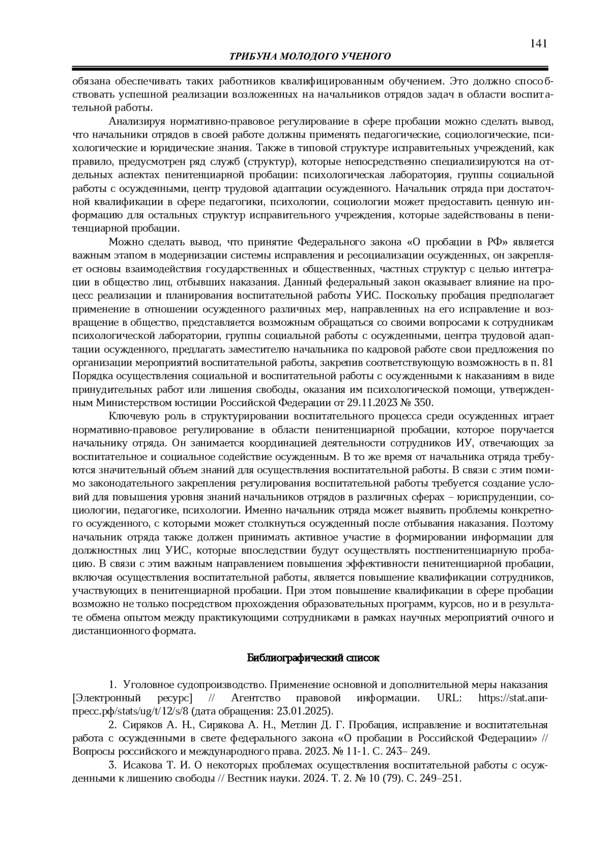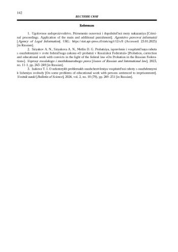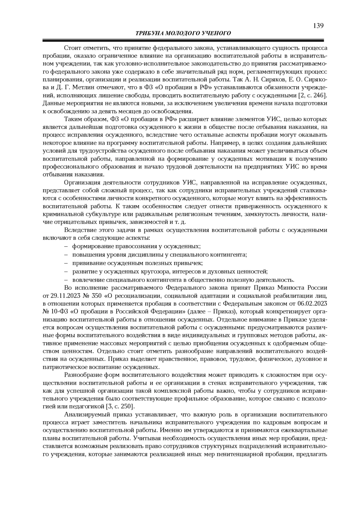2. 	Сиряков А. Н., Сирякова А. Н., Метлин Д. Г. Пробация, исправление и воспитательная работа с осужденными в свете федерального закона “О пробации в Российской Федерации” // Вопросы российского и международного права. 2023. № 11-1. С. 243- 249. EDN: PSPERV