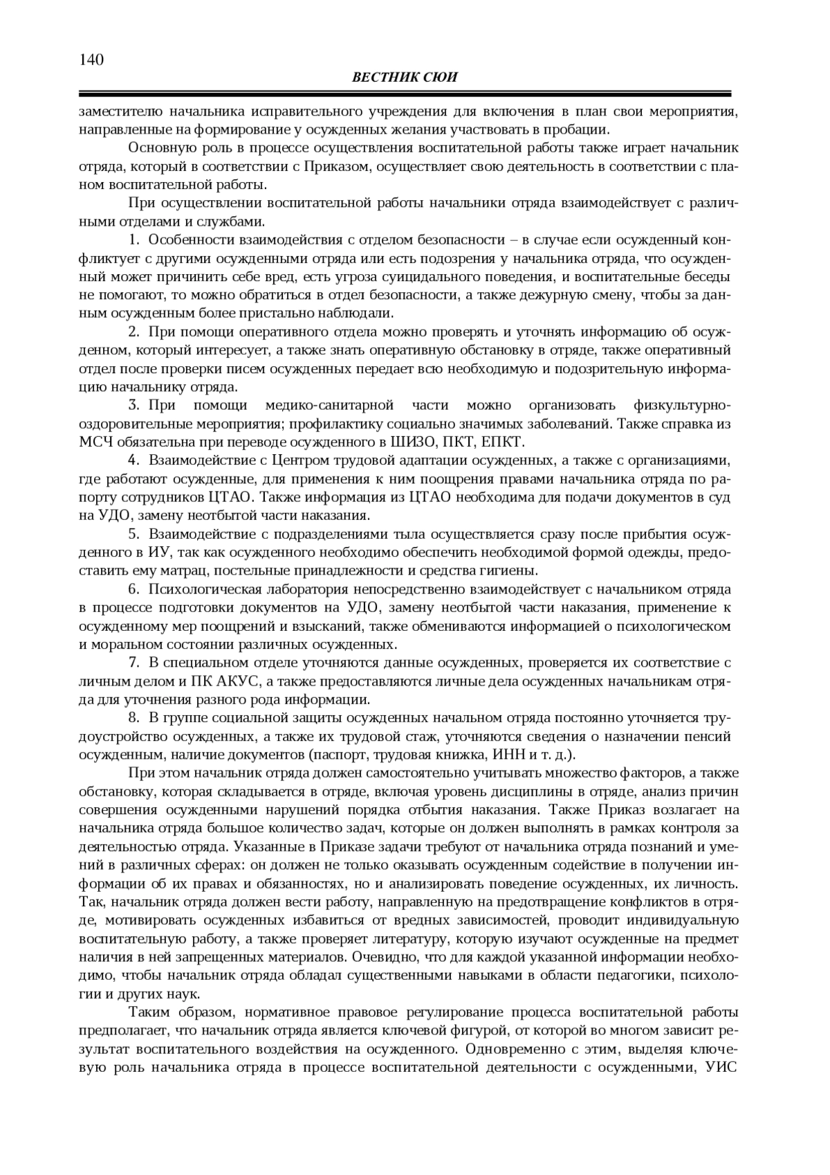 3. 	Исакова Т. И. О некоторых проблемах осуществления воспитательной работы с осужденными к лишению свободы // Вестник науки. 2024. Т. 2. № 10 (79). С. 249-251. EDN: WSSMEH