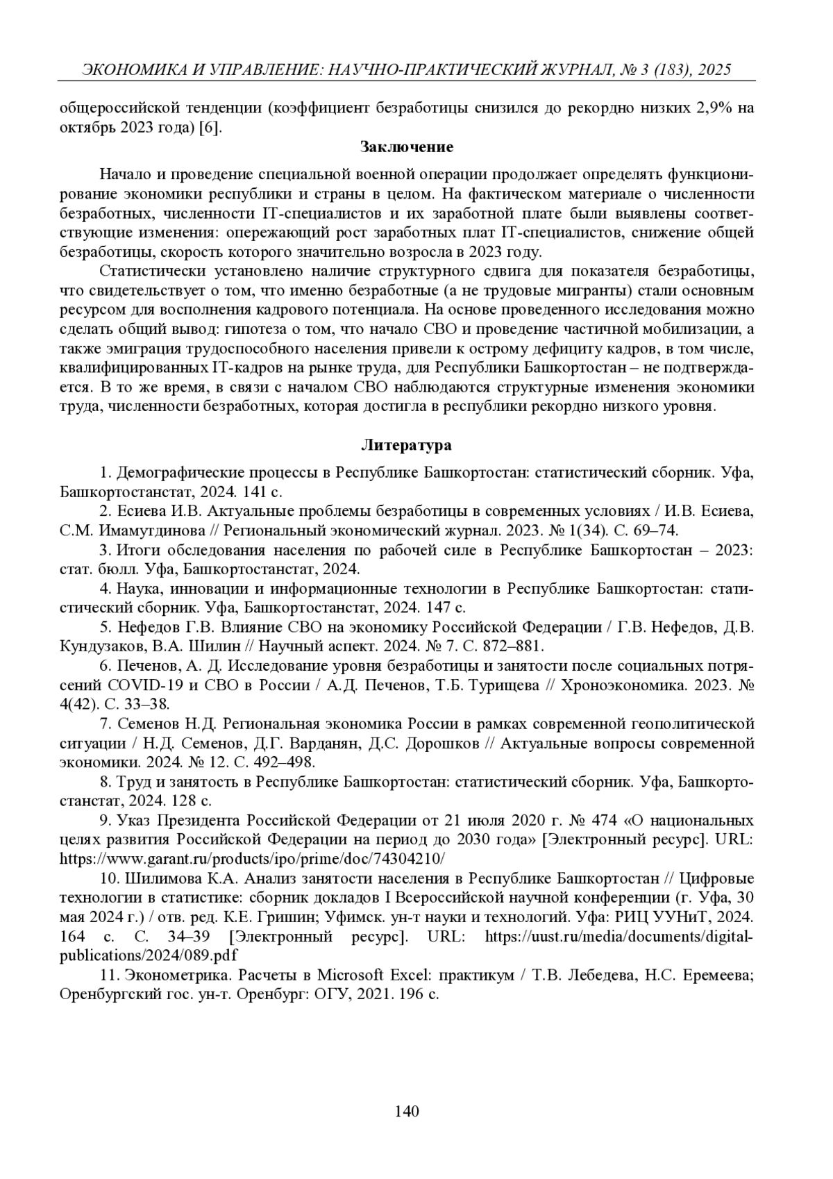2. Есиева И.В. Актуальные проблемы безработицы в современных условиях / И.В. Есиева, С.М. Имамутдинова // Региональный экономический журнал. 2023. № 1(34). С. 69-74. EDN: STEGCS