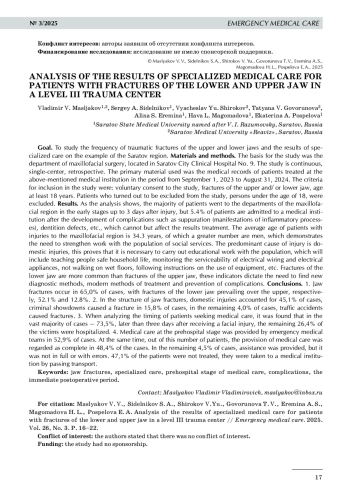 3. 	Масляков В.В., Сидельников С. А., Барачевский Ю. Е. и др. Уровень знаний медицинских работников, оказывающих помощь пострадавшим с травматическими повреждениями лицевого черепа, полученными в результате дорожно-транспортных происшествий // Скорая медицинская помощь. 2024. Т. 25, № 1. С. 27-32.