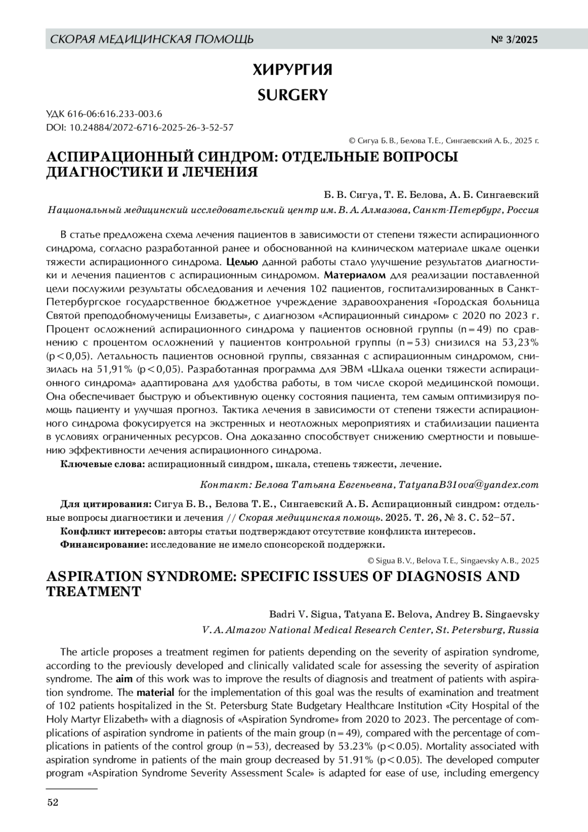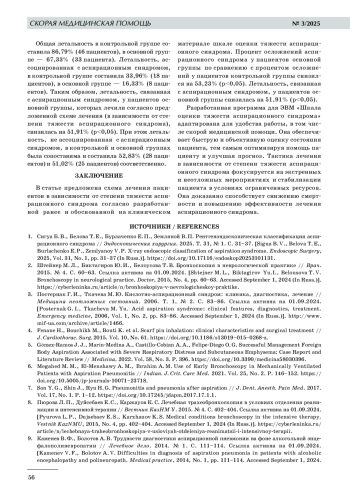 В статье предложена схема лечения пациентов в зависимости от степени тяжести аспирационного синдрома, согласно разработанной ранее и обоснованной на клиническом материале шкале оценки тяжести аспирационного синдрома. Целью данной работы стало улучшение результатов диагностики и лечения пациентов с аспирационным синдромом. Материалом для реализации поставленной цели послужили результаты обследования и лечения 102 пациентов, госпитализированных в СанктПетербургское государственное бюджетное учреждение здравоохранения «Городская больница Святой преподобномученицы Елизаветы», с диагнозом «Аспирационный синдром» с 2020 по 2023 г. Процент осложнений аспирационного синдрома у пациентов основной группы (n=49) по сравнению с процентом осложнений у пациентов контрольной группы (n=53) снизился на 53,23% (р<0,05). Летальность пациентов основной группы, связанная с аспирационным синдромом, снизилась на 51,91% (р<0,05). Разработанная программа для ЭВМ «Шкала оценки тяжести аспирационного синдрома» адаптирована для удобства работы, в том числе скорой медицинской помощи. Она обеспечивает быструю и объективную оценку состояния пациента, тем самым оптимизируя помощь пациенту и улучшая прогноз. Тактика лечения в зависимости от степени тяжести аспирационного синдрома фокусируется на экстренных и неотложных мероприятиях и стабилизации пациента в условиях ограниченных ресурсов. Она доказанно способствует снижению смертности и повышению эффективности лечения аспирационного синдрома.