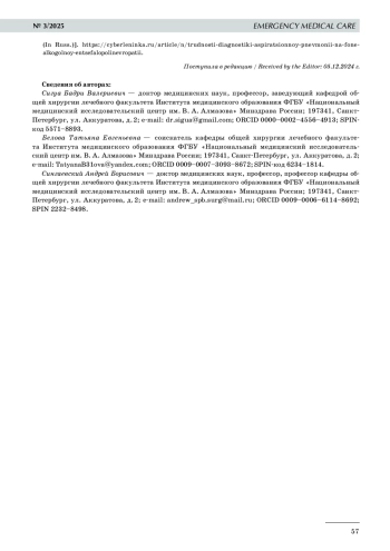 9. Каменев В. Ф., Болотов А. В. Трудности диагностики аспирационной пневмонии на фоне алкогольной энцефалополиневропатии // Лечебное дело. 2014. № 1. С. 111-114. Ссылка активна на 01.09.2024.