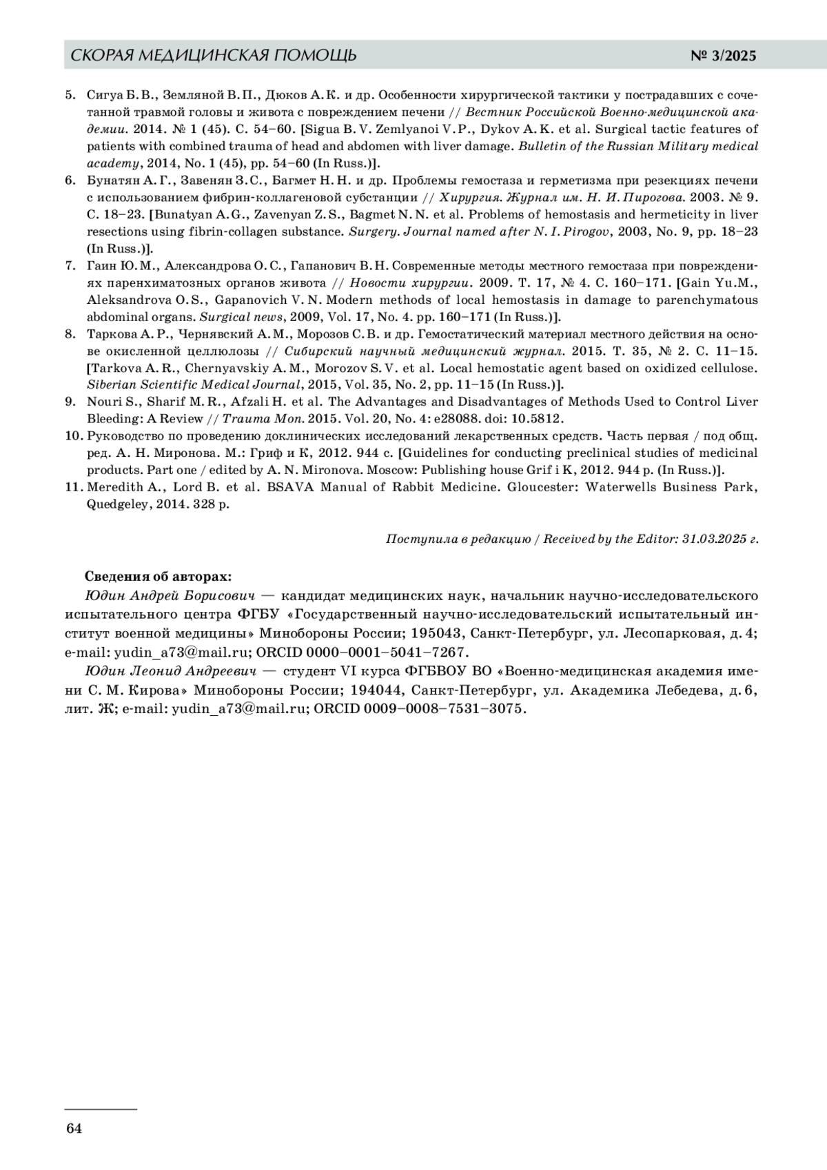 Gain Yu.M., Aleksandrova O. S., Gapanovich V. N. Modern methods of local hemostasis in damage to parenchymatous abdominal organs. Surgical news, 2009, Vol. 17, No. 4. рр. 160-171 (In Russ.).