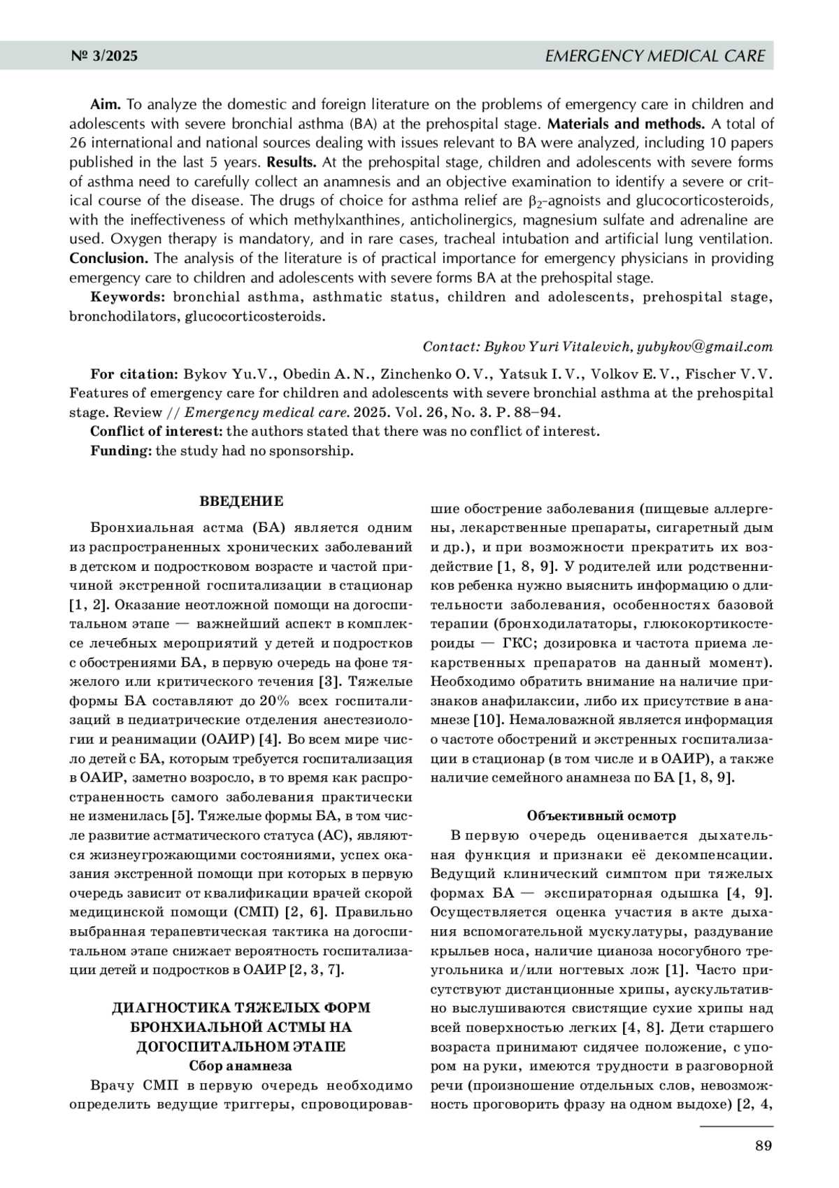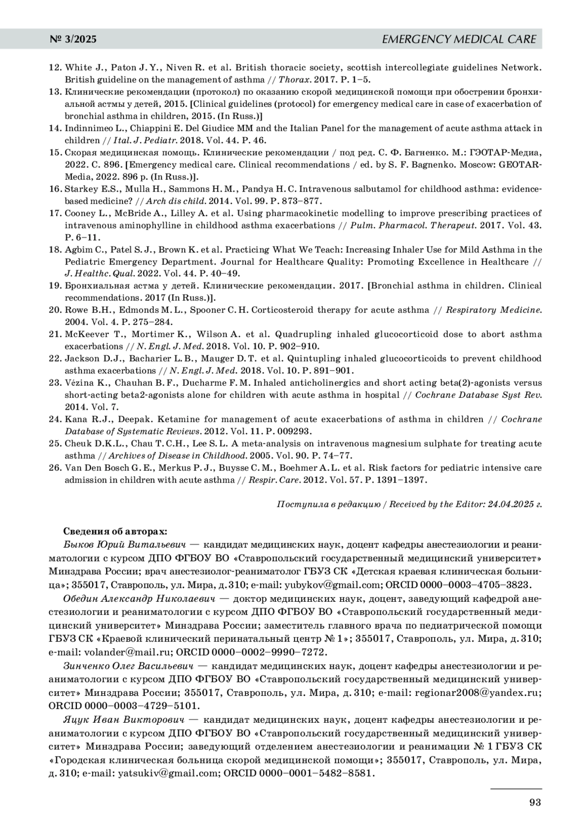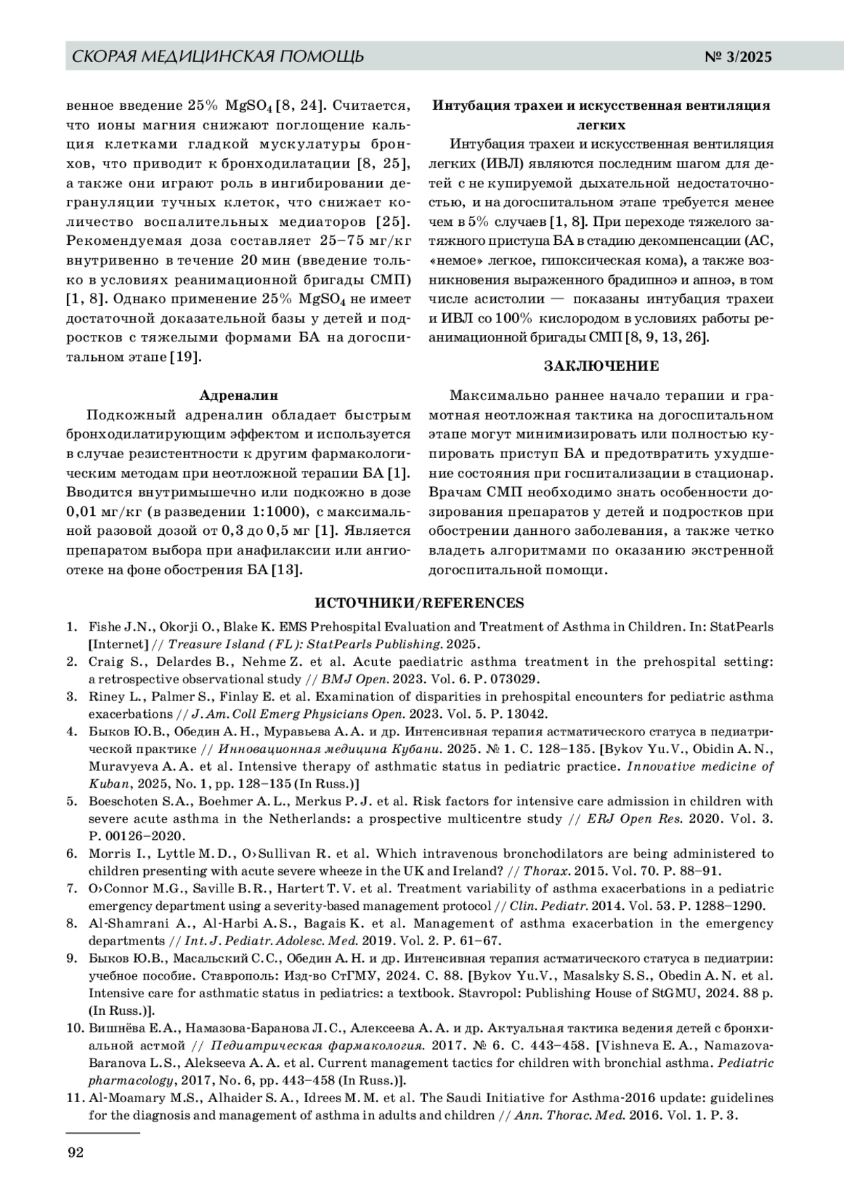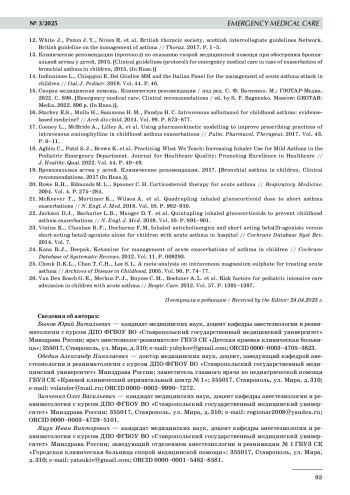1. 	Fishe J.N., Okorji O., Blake K. EMS Prehospital Evaluation and Treatment of Asthma in Children. In: StatPearls [Internet] // Treasure Island (FL): StatPearls Publishing. 2025.