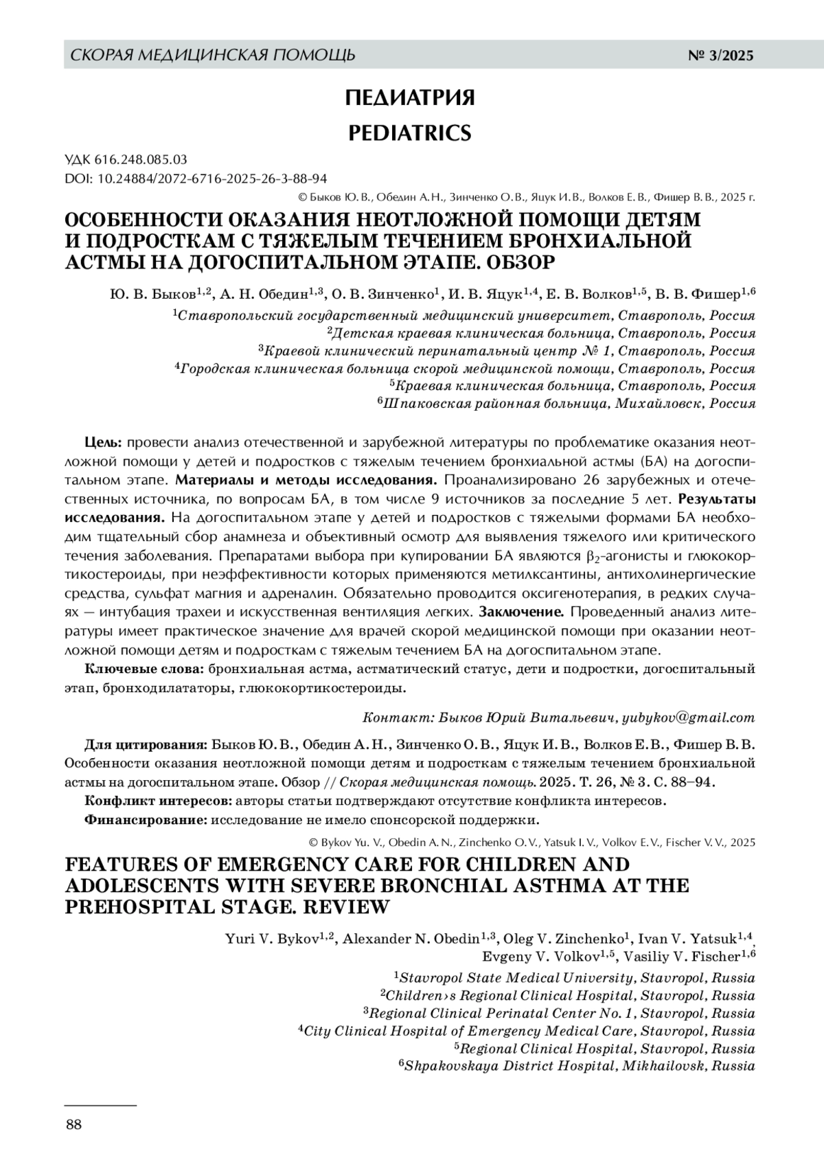 4. 	Быков Ю.В., Обедин А. Н., Муравьева А. А. и др. Интенсивная терапия астматического статуса в педиатрической практике // Инновационная медицина Кубани. 2025. № 1. С. 128-135.