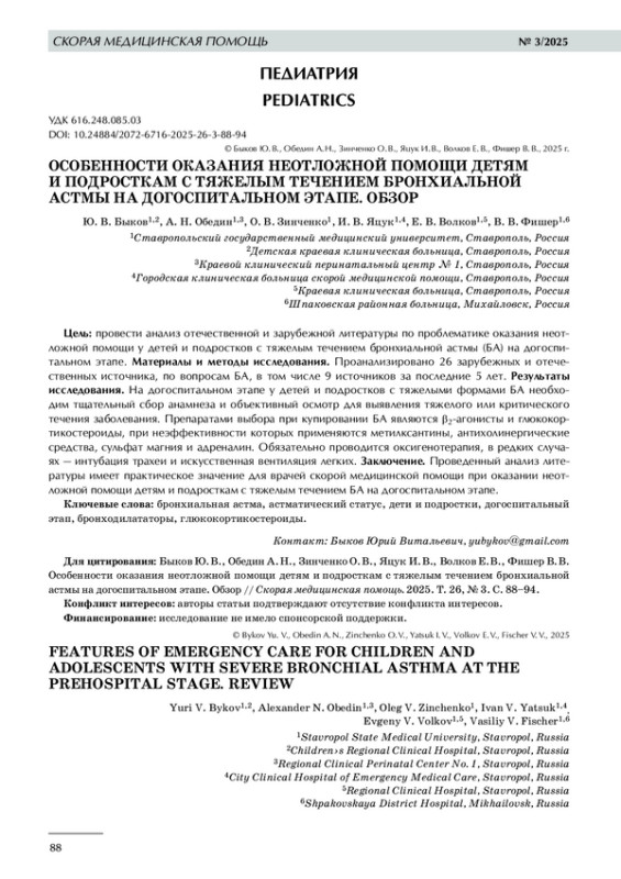 9. 	Быков Ю.В., Масальский С. С., Обедин А. Н. и др. Интенсивная терапия астматического статуса в педиатрии: учебное пособие. Ставрополь: Изд-во СтГМУ, 2024. C. 88.