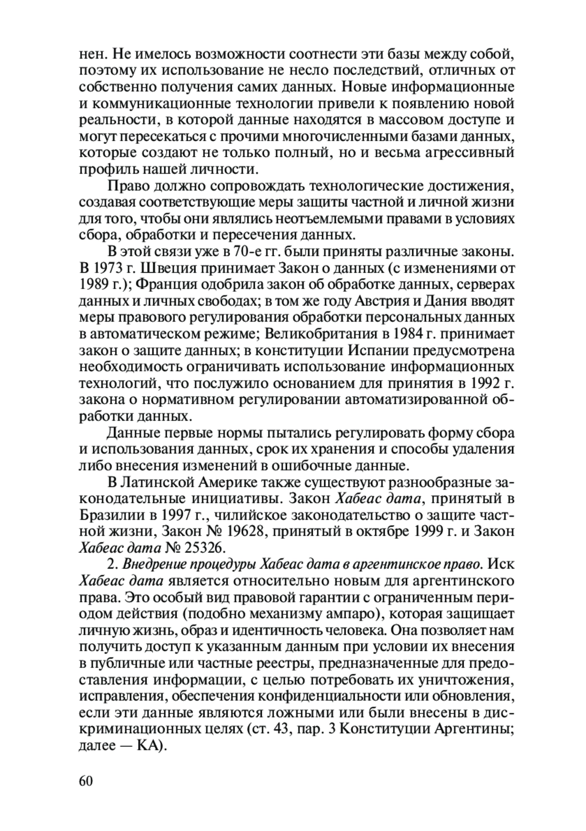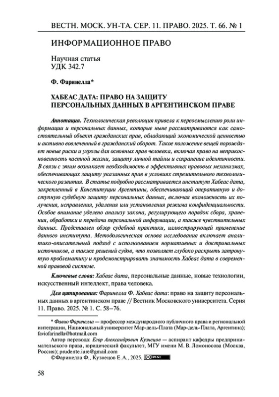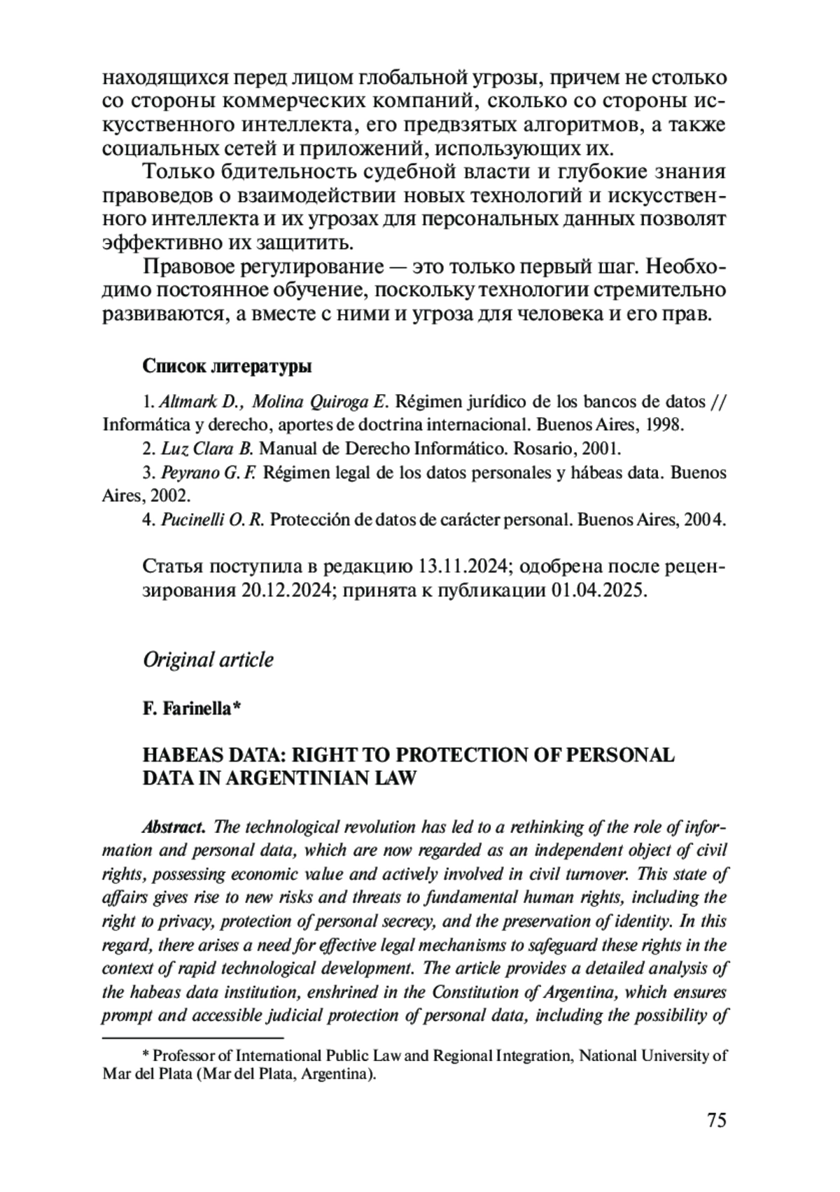 Технологическая революция привела к переосмыслению роли инфор мации и персональных данных, которые ныне рассматриваются как самостоятельный объект гражданских прав, обладающий экономической ценностью и активно вовлеченный в гражданский оборот. Такое положение вещей порождает новые риски и угрозы для основных прав человека, включая право на неприкосновенность частной жизни, защиту личной тайны и сохранение идентичности. В связи с этим возникает необходимость в эффективных правовых механизмах, обеспечивающих защиту указанных прав в условиях стремительного технологического развития. В статье подробно рассматривается институт Хабеас дата, закрепленный в Конституции Аргентины, обеспечивающий оперативную и доступную судебную защиту персональных данных, включая возможность их получения, исправления, удаления или установления режима конфиденциальности. Особое внимание уделено анализу закона, регулирующего порядок сбора, хранения, обработки и передачи персональной информации, а также чувствительных данных. Представлен обзор судебной практики, иллюстрирующей применение данного института. Методологическая основа исследования включает аналитико-описательный подход с использованием нормативных и доктринальных источников, а также решений судов, что позволяет глубоко раскрыть затронутую проблематику и продемонстрировать значимость Хабеас дата в современной правовой системе.