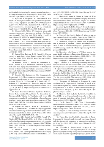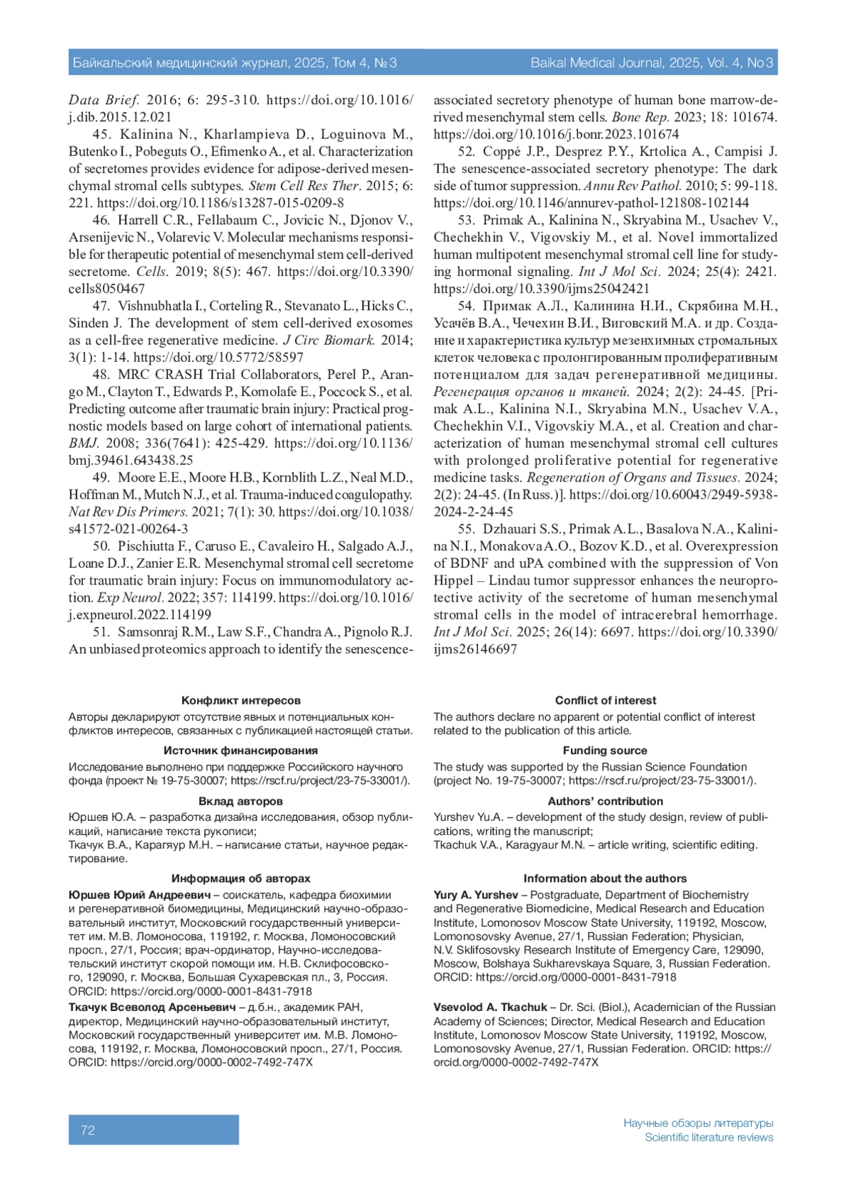 52. 	Pischiutta F., Caruso E., Cavaleiro H. et al. Mesenchymal stromal cell secretome for traumatic brain injury: focus on immunomodulatory action. Exp Neurol. 2022;357:114199. DOI: 10.1016/j.expneurol.2022.114199