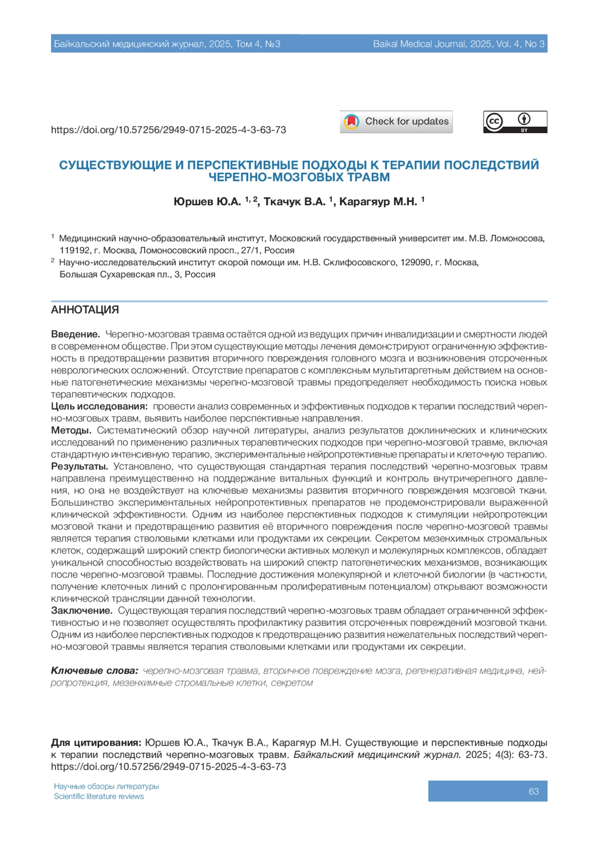 Методы. Систематический обзор научной литературы, анализ результатов доклинических и клинических исследований по применению различных терапевтических подходов при черепно-мозговой травме, включая стандартную интенсивную терапию, экспериментальные нейропротективные препараты и клеточную терапию.