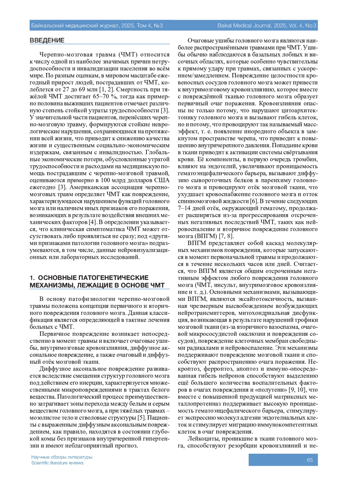 10. 	Orr T.J., Lesha E., Kramer A.H. et al. Traumatic brain injury: a comprehensive review of biomechanics and molecular pathophysiology. World Neurosurg. 2024;185:74-88. DOI: 10.1016/j.wneu.2024.01.084
