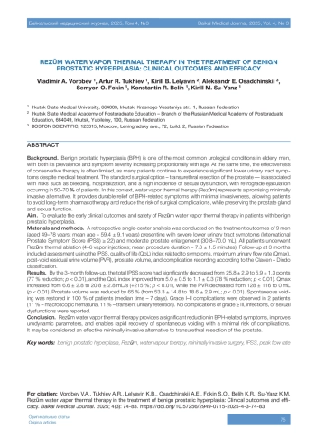 Материалы и методы. Выполнен ретроспективный одноцентровой анализ результатов лечения 9 мужчин (49–78 лет; средний возраст – 59,4 ± 9,1 года) с тяжёлыми симптомами со стороны нижних мочевых путей (IPSS ≥ 22) и умеренным увеличением простаты (30,8–70,0 мл). Всем пациентам проведена термоабляция Rezūm (4–6 инъекций пара; средняя продолжительность – 7,8 ± 1,5 мин). Контрольная оценка через 3 месяца включала оценку по шкале International Prostate Symptom Score и связанный с симптомами индекс качества жизни, максимальную скорость потока мочи, объём остаточной мочи, объём простаты и регистрацию осложнений (по классификации Клавьена – Диндо).