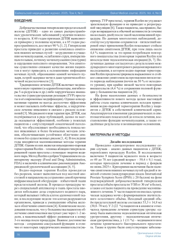 Заключение. Водно-паровая термотерапия Rezūm обеспечивает значимое снижение симптомов доброкачественной гиперплазии простаты, улучшение уродинамики и быстрое восстановление мочеиспускания при минимальном риске осложнений. Метод может рассматриваться как эффективная малоинвазивная альтернатива трансуретральной резекции простаты.
