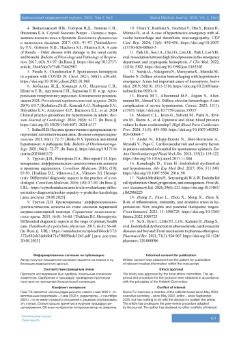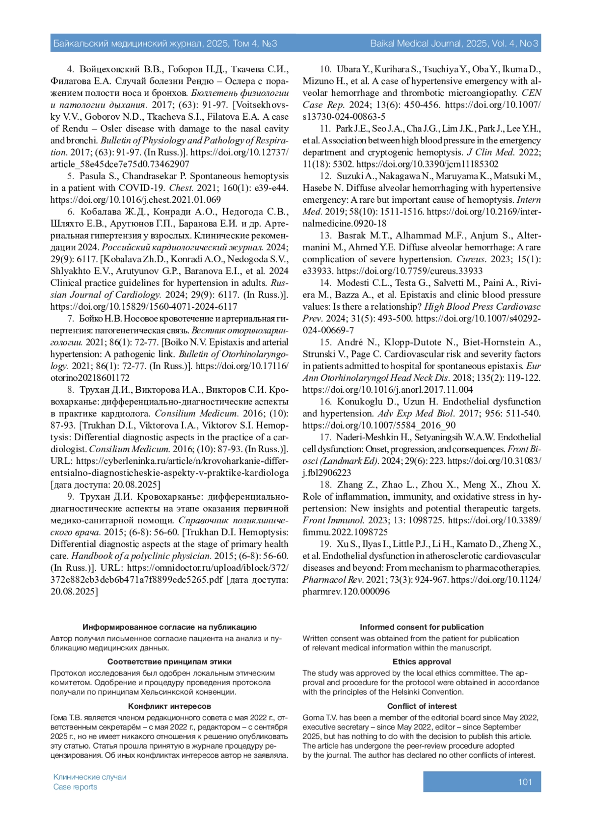 7. Бойко Н.В. Носовое кровотечение и артериальная гипертензия: патогенетическая связь. Вестник оториноларингологии. 2021;86(1):72-77. DOI: 10.17116/otorino20218601172