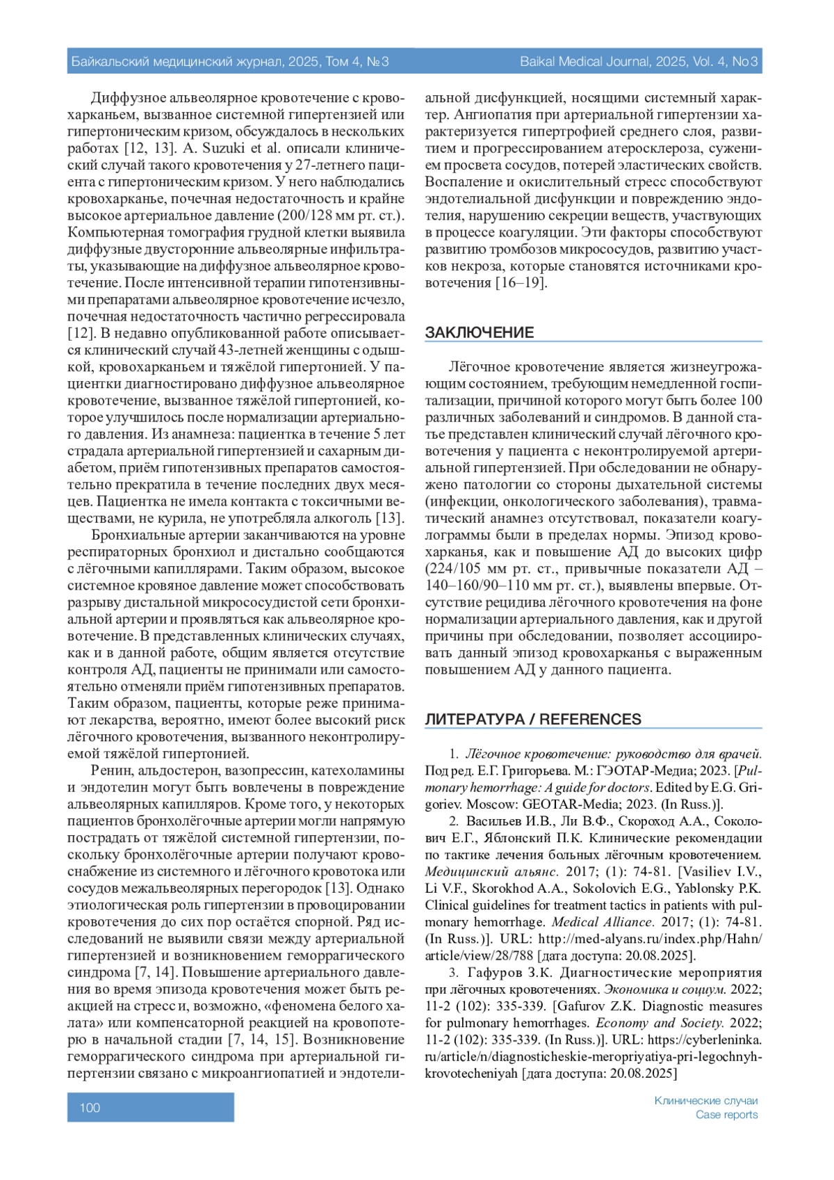 13. Basrak M.T., Alhammad M.F., Anjum S., Altermanini M., Ahmed Y.E. Diffuse Alveolar Hemorrhage: A Rare Complication of Severe Hypertension. Cureus. 2023;15(1):e33933. DOI: 10.7759/cureus.33933