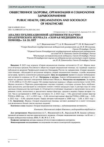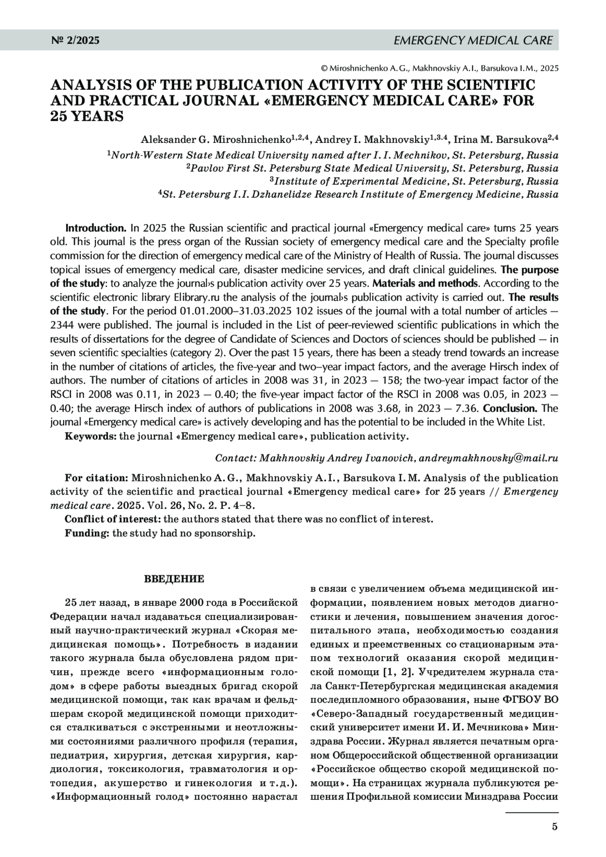 Miroshnichenko A. G., Ruksin V. V.Russian scientific and practical journal “Emergency medical care” - 5 years of work: results and prospects. Emergency medical care, 2005, Vol. 6, No. 1, pp. 3-5 (In Russ.).