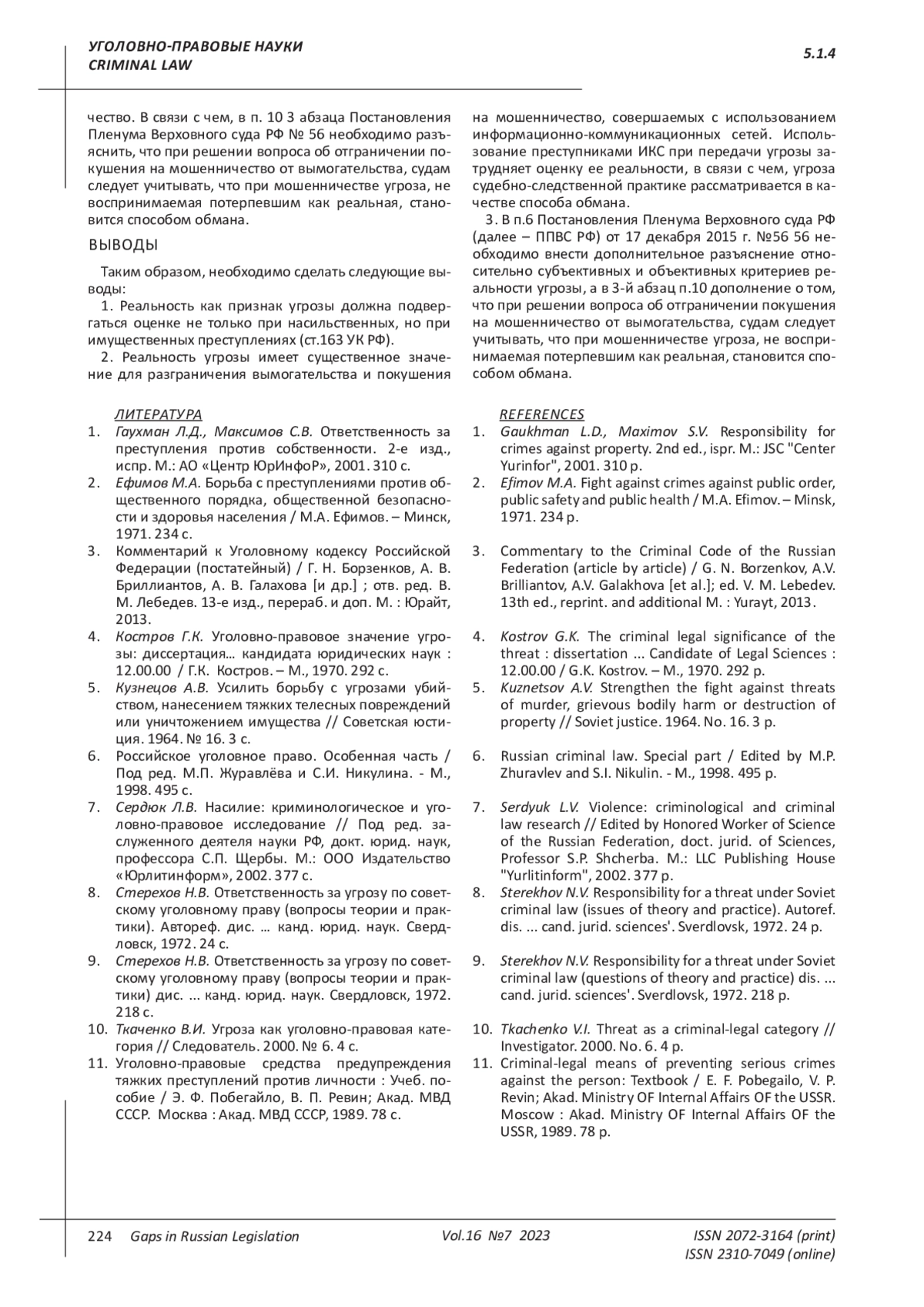 Kuznetsov A.V. Strengthen the fight against threats of murder, grievous bodily harm or destruction of property // Soviet justice. 1964. No. 16. 3 p.