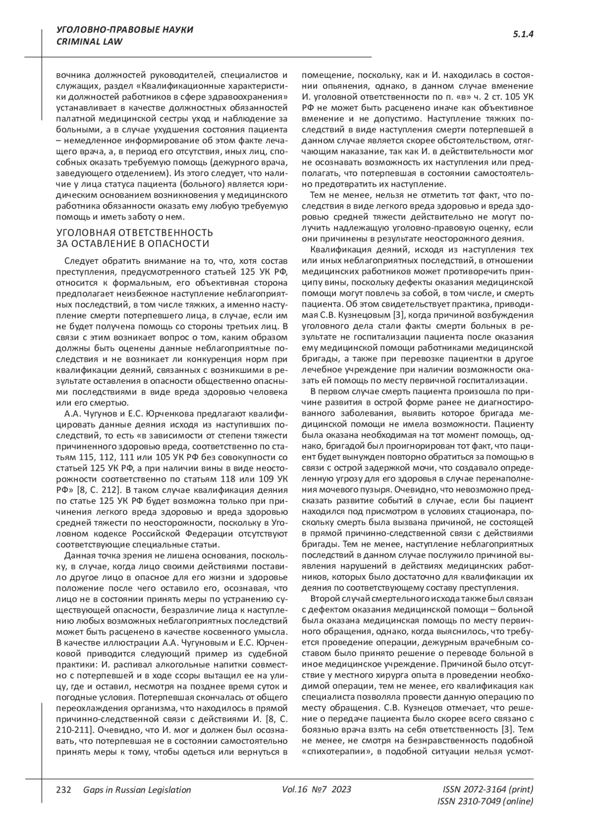 7. Тюнин В.И., Огарь Т.А. Оставление в опасности - через призму судебной практики // Уголовное право. 2018. № 5. Доступ из СПС “КонсультантПлюс”. EDN: FTLKIP
