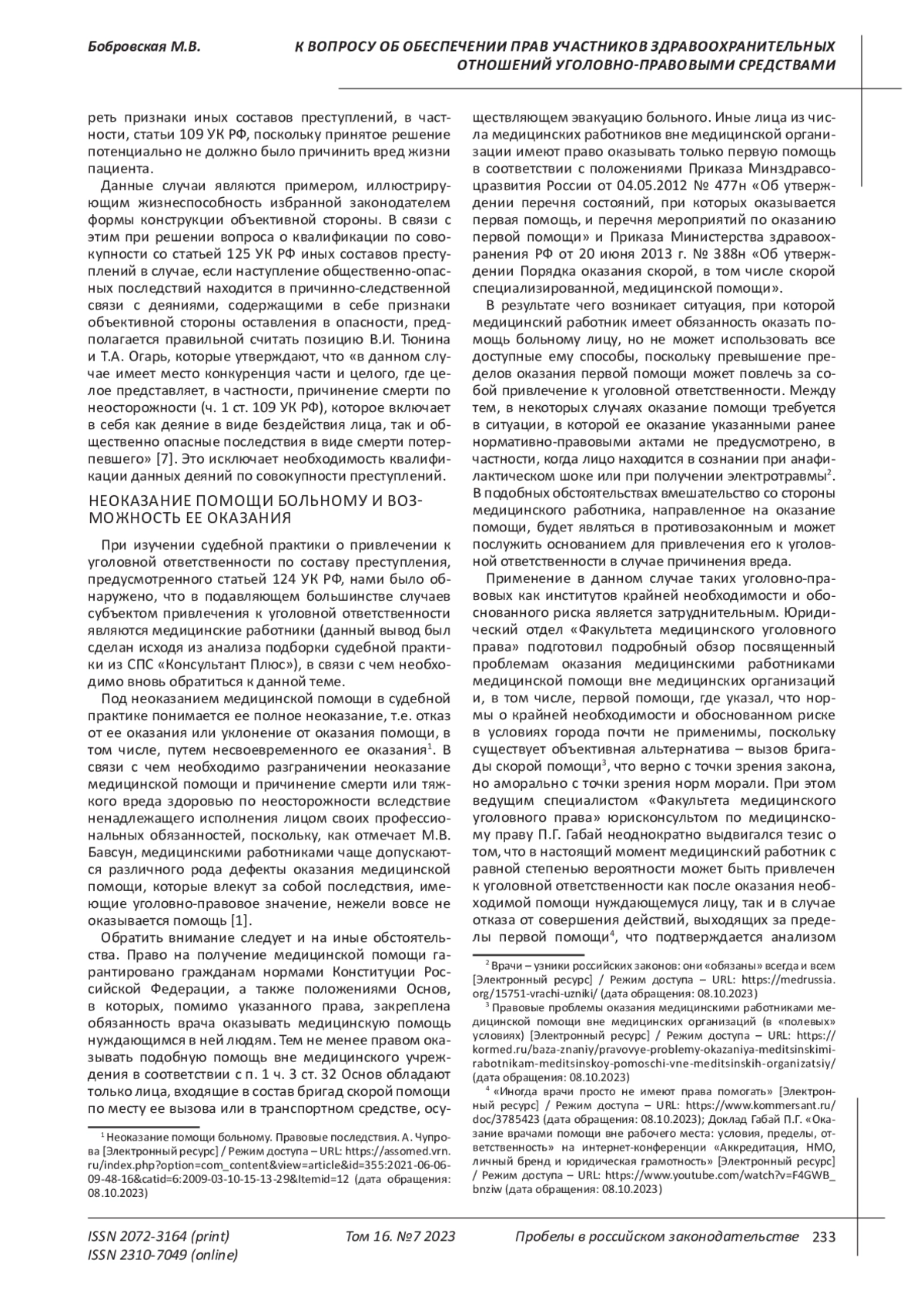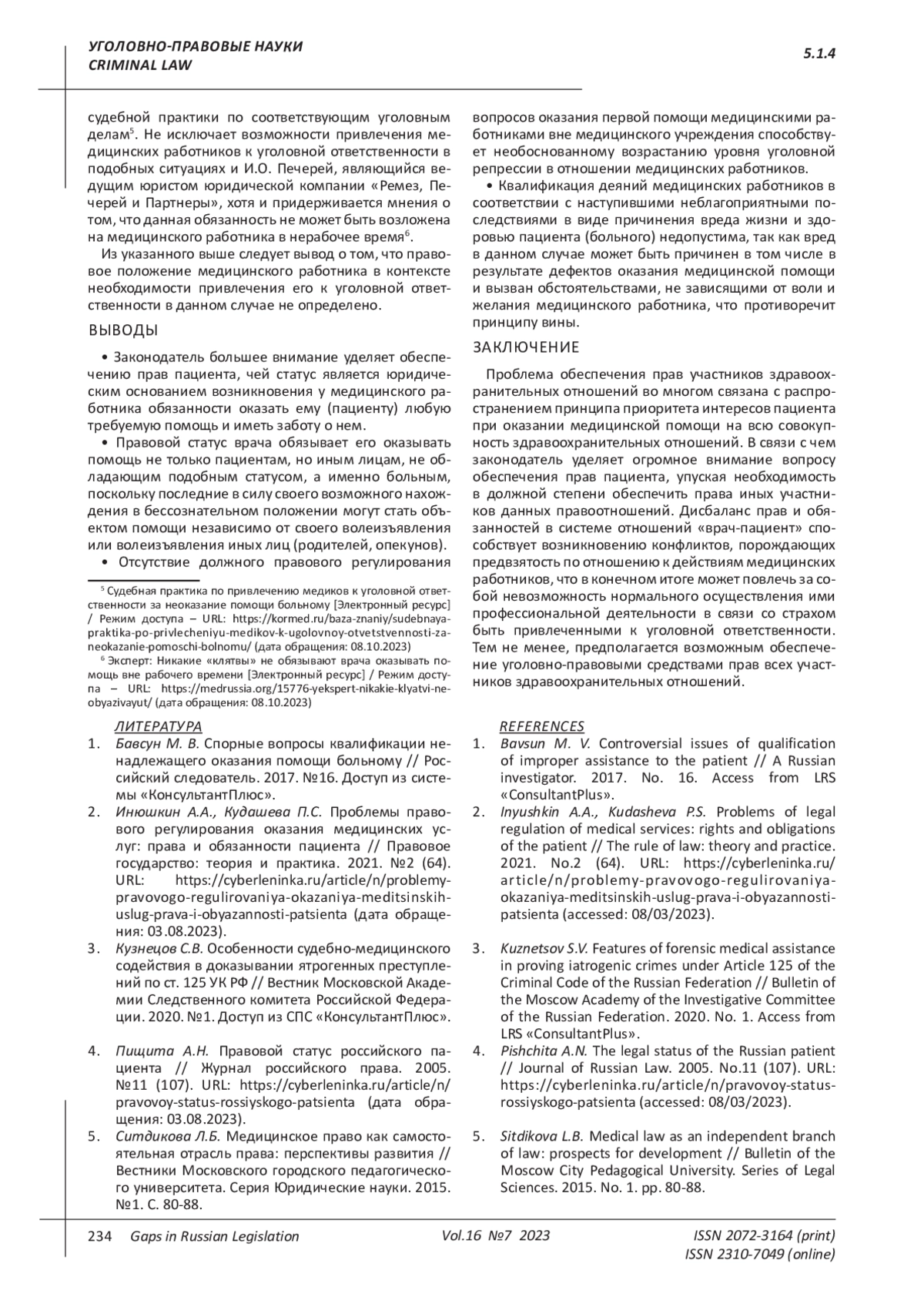 1. Бавсун М. В. Спорные вопросы квалификации ненадлежащего оказания помощи больному // Российский следователь. 2017. №16. Доступ из системы “КонсультантПлюс”. EDN: ZEOULP