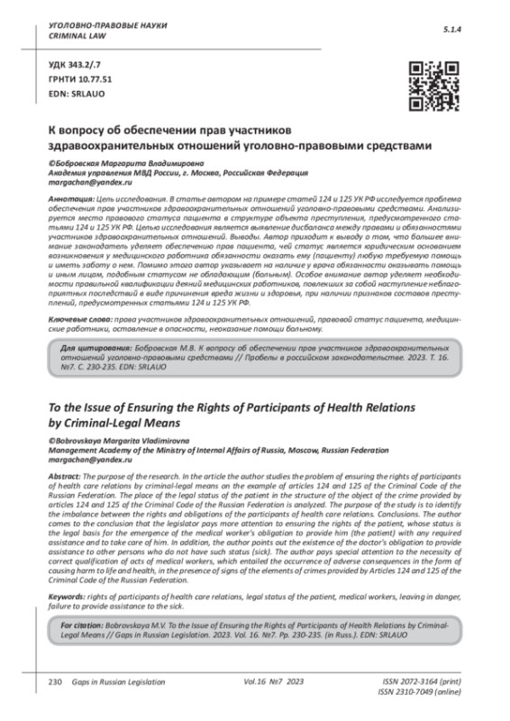 Цель исследования. В статье автором на примере статей 124 и 125 УК РФ исследуется проблема обеспечения прав участников здравоохранительных отношений уголовно-правовыми средствами. Анализируется место правового статуса пациента в структуре объекта преступления, предусмотренного статьями 124 и 125 УК РФ. Целью исследования является выявление дисбаланса между правами и обязанностями участников здравоохранительных отношений. Выводы. Автор приходит к выводу о том, что большее внимание законодатель уделяет обеспечению прав пациента, чей статус является юридическим основанием возникновения у медицинского работника обязанности оказать ему (пациенту) любую требуемую помощь и иметь заботу о нем. Помимо этого автор указывает на наличие у врача обязанности оказывать помощь и иным лицам, подобным статусом не обладающим (больным). Особое внимание автор уделяет необходимости правильной квалификации деяний медицинских работников, повлекших за собой наступление неблагоприятных последствий в виде причинения вреда жизни и здоровья, при наличии признаков составов преступлений, предусмотренных статьями 124 и 125 УК РФ.