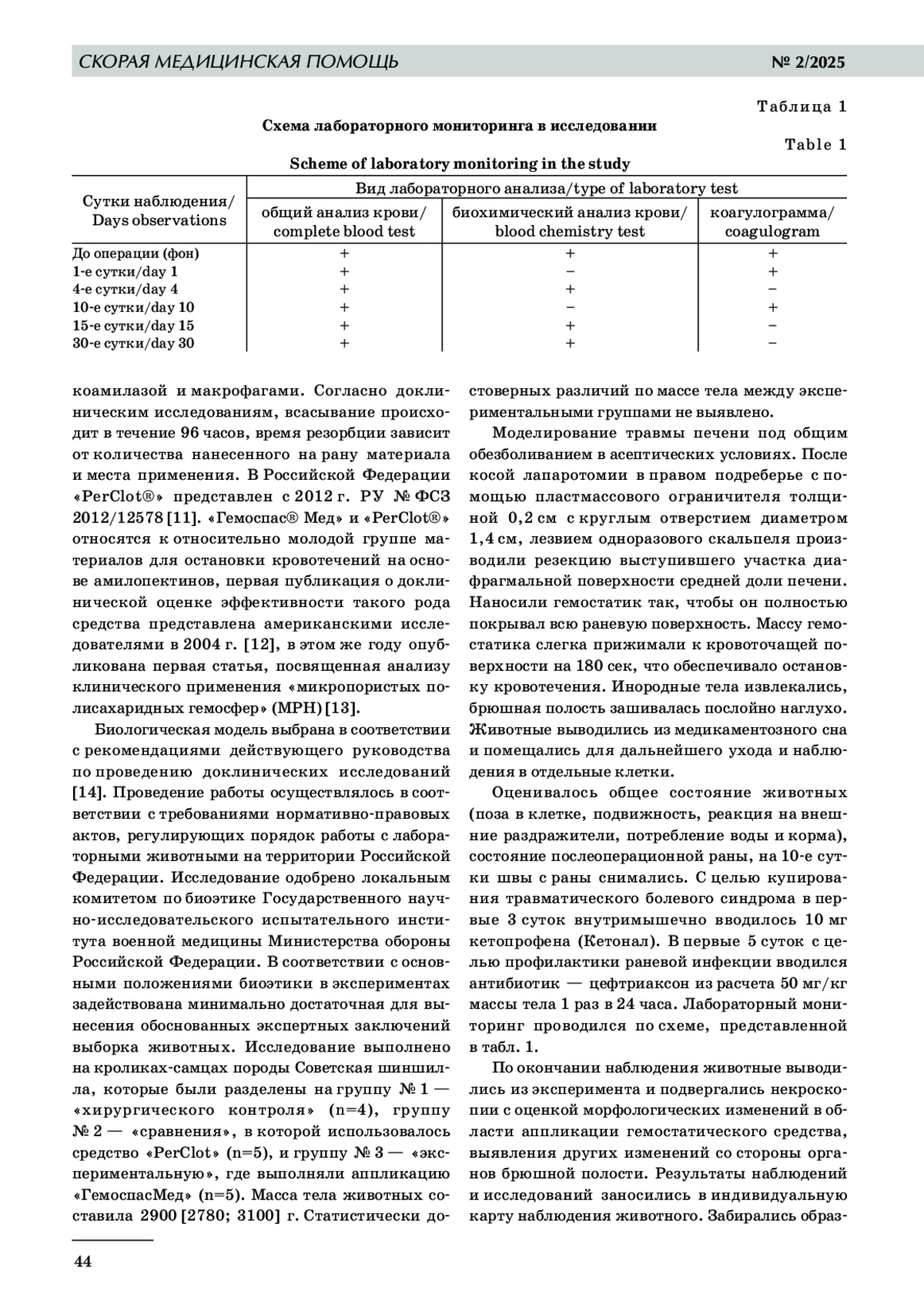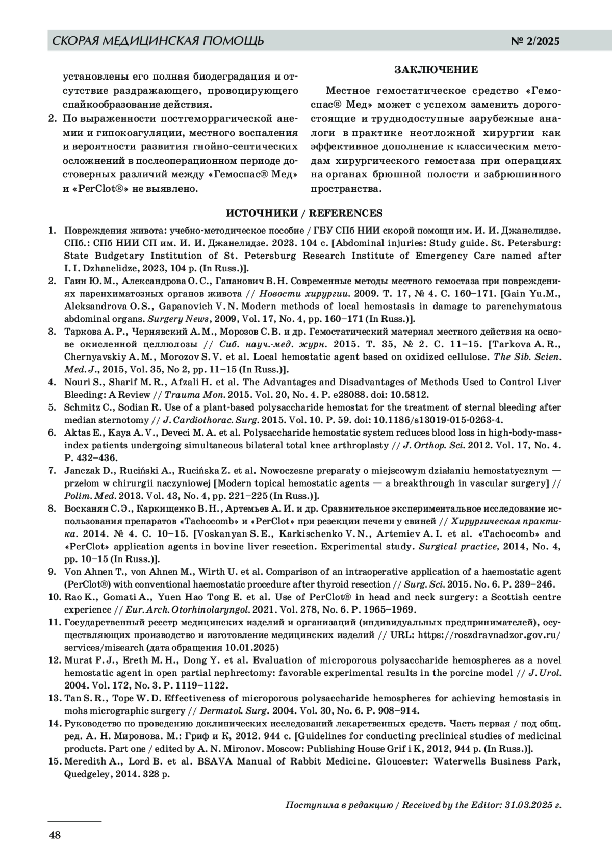 7. 	Janczak D., Rucinski A., Rucinska Z. et al. Nowoczesne preparaty o miejscowym dzialaniu hemostatycznym - przelom w chirurgii naczyniowej [Modern topical hemostatic agents - a breakthrough in vascular surgery] // Polim. Med. 2013. Vol. 43, No. 4, рр. 221-225 (In Russ.)].