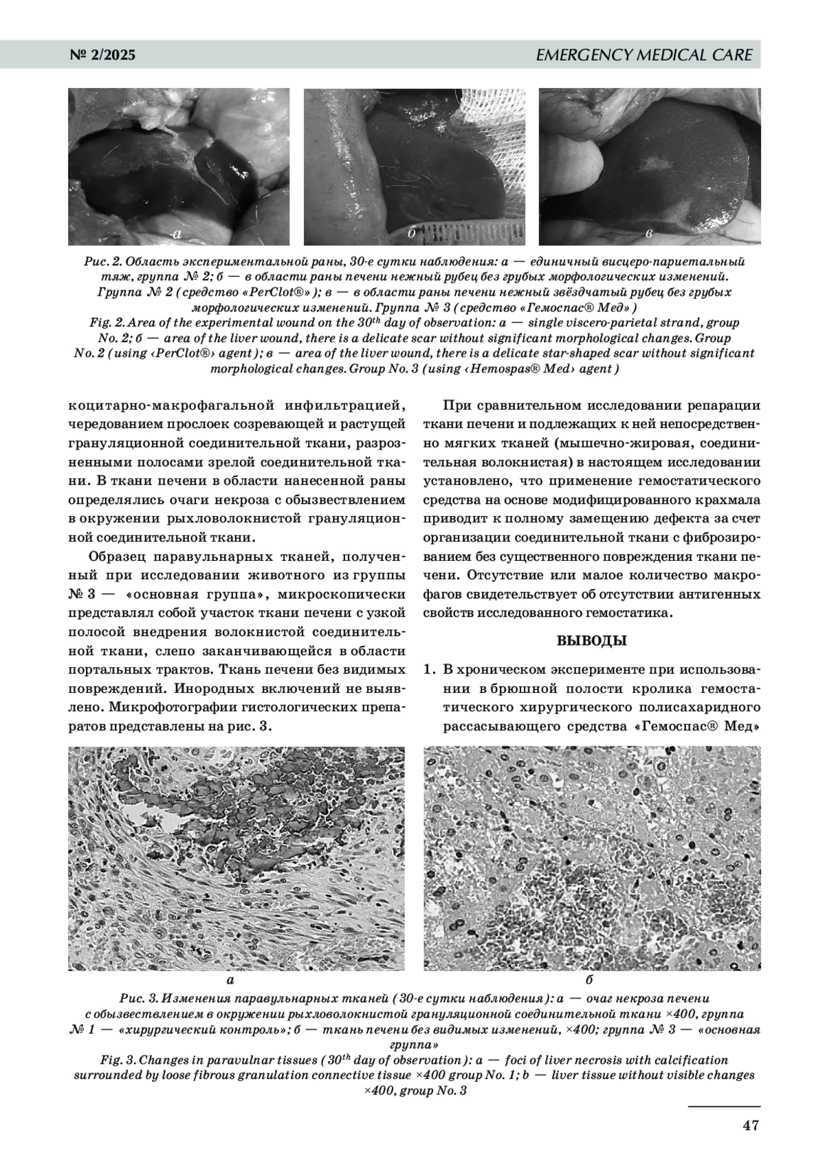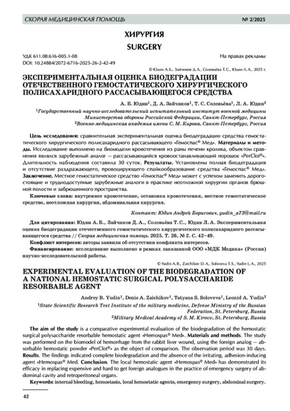 Цель исследования: сравнительная экспериментальная оценка биодеградации средства гемостатического хирургического полисахаридного рассасывающего «Гемоспас® Мед». Материалы и методы. Исследование выполнено на биомодели кровотечения из раны печени кролика, объектом сравнения являлся зарубежный аналог — рассасывающийся кровоостанавливающий порошок «PerClot®». Длительность наблюдения составила 30 суток. Результаты. Установлены полная биодеградация и отсутствие раздражающего, провоцирующего спайкообразование средства «Гемоспас® Мед». Заключение. Местное гемостатическое средство «Гемоспас® Мед» может с успехом заменить дорогостоящие и труднодоступные зарубежные аналоги в практике неотложной хирургии органов брюшной полости и забрюшинного пространства.