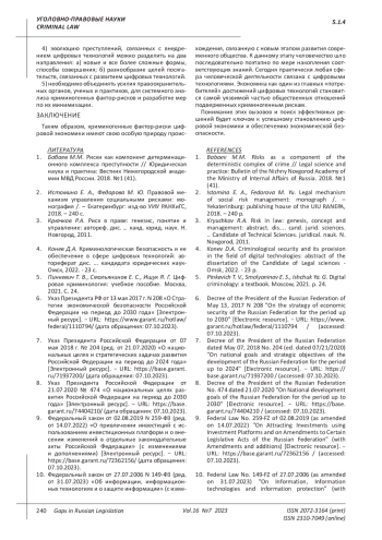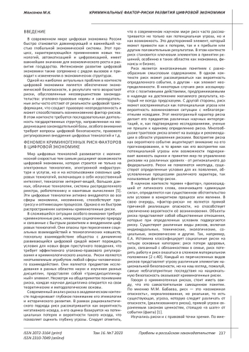 В научной литературе получили свое отражения исследования в сфере цифровых технологий, в которых представлен не только вид цифровой преступности и анализ криминогенных рисков, но и классификация названных рисков. Так, например, Д. А. Конев классифицирует криминологические риски на три категории: а) риски, ассоциированные с внедрением цифровых технологий; б) высокие технологические риски; в) риски, определяемые системой причин и условий, предрасполагающих к совершению преступлений в определенной сфере, включая социально-политические, экономические, психологические, правовые и технические аспекты [5]. Соглашаясь с мнением автора, полагаем, что риски указанных категорий в полной мере соответствуют криминогенным фактор-рискам цифровой экономики и требуют всестороннего анализа и оценки со стороны правоохранительных органов.