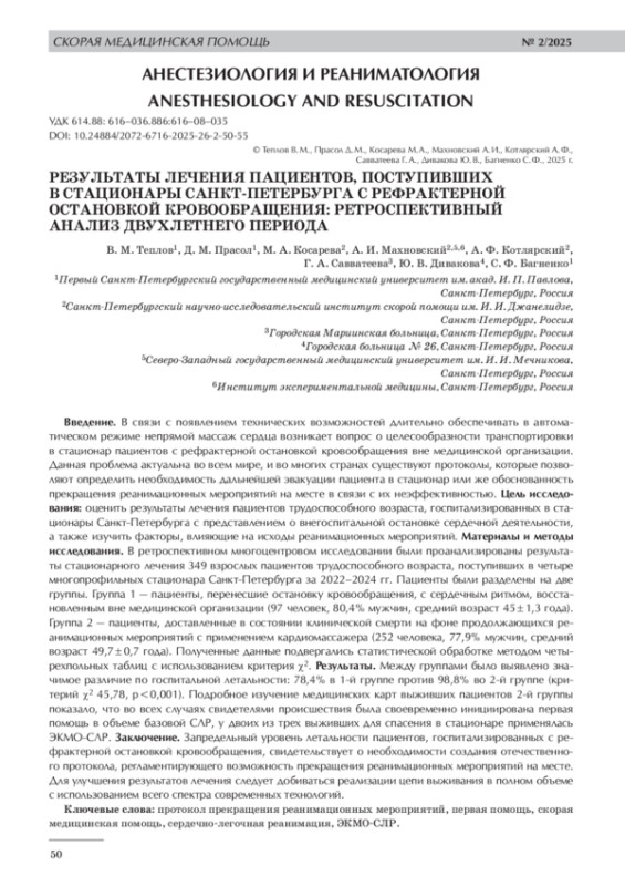 В связи с появлением технических возможностей длительно обеспечивать в автоматическом режиме непрямой массаж сердца возникает вопрос о целесообразности транспортировки в стационар пациентов с рефрактерной остановкой кровообращения вне медицинской организации. Данная проблема актуальна во всем мире, и во многих странах существуют протоколы, которые позволяют определить необходимость дальнейшей эвакуации пациента в стационар или же обоснованность прекращения реанимационных мероприятий на месте в связи с их неэффективностью. Цель исследования: оценить результаты лечения пациентов трудоспособного возраста, госпитализированных в стационары Санкт-Петербурга с представлением о внегоспитальной остановке сердечной деятельности, а также изучить факторы, влияющие на исходы реанимационных мероприятий. Материалы и методы исследования. В ретроспективном многоцентровом исследовании были проанализированы результаты стационарного лечения 349 взрослых пациентов трудоспособного возраста, поступивших в четыре многопрофильных стационара Санкт-Петербурга за 2022–2024 гг. Пациенты были разделены на две группы. Группа 1 — пациенты, перенесшие остановку кровообращения, с сердечным ритмом, восстановленным вне медицинской организации (97 человек, 80,4% мужчин, средний возраст 45±1,3 года). Группа 2 — пациенты, доставленные в состоянии клинической смерти на фоне продолжающихся реанимационных мероприятий с применением кардиомассажера (252 человека, 77,9% мужчин, средний возраст 49,7±0,7 года). Полученные данные подвергались статистической обработке методом четырехпольных таблиц с использованием критерия χ2. Результаты. Между группами было выявлено значимое различие по госпитальной летальности: 78,4% в 1‑й группе против 98,8% во 2‑й группе (критерий χ2 45,78, p<0,001). Подробное изучение медицинских карт выживших пациентов 2‑й группы показало, что во всех случаях свидетелями происшествия была своевременно инициирована первая помощь в объеме базовой СЛР, у двоих из трех выживших для спасения в стационаре применялась ЭКМО-СЛР. Заключение. Запредельный уровень летальности пациентов, госпитализированных с рефрактерной остановкой кровообращения, свидетельствует о необходимости создания отечественного протокола, регламентирующего возможность прекращения реанимационных мероприятий на месте. Для улучшения результатов лечения следует добиваться реализации цепи выживания в полном объеме с использованием всего спектра современных технологий.