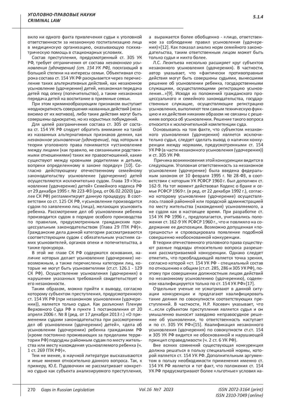 9. Леонтьева Л.С. Понятие противоправного действия, связанного с усыновлением. Субъекты противоправных действий // Семейное и жилищное право. 2013. № 6. С. 15-18. EDN: RNHGBF