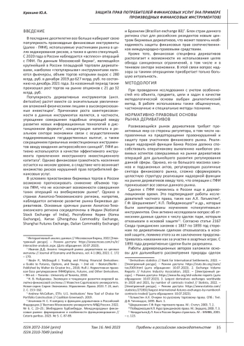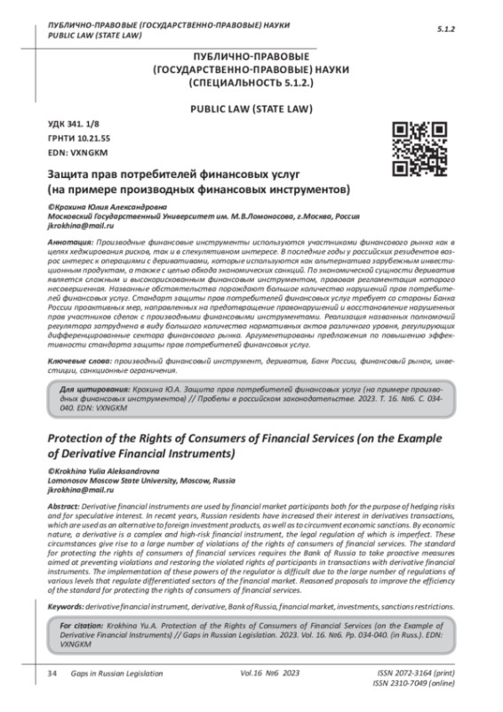 Производные финансовые инструменты используются участниками финансового рынка как в целях хеджирования рисков, так и в спекулятивном интересе. В последние годы у российских резидентов возрос интерес к операциями с деривативами, которые используются как альтернатива зарубежным инвестиционным продуктам, а также с целью обхода экономических санкций. По экономической сущности дериватив является сложным и высокорискованным финансовым инструментом, правовая регламентация которого несовершенная. Названные обстоятельства порождают большое количество нарушений прав потребителей финансовых услуг. Стандарт защиты прав потребителей финансовых услуг требует со стороны Банка России проактивных мер, направленных на предотвращение правонарушений и восстановление нарушенных прав участников сделок с производными финансовыми инструментами. Реализация названных полномочий регулятора затруднена в виду большого количества нормативных актов различного уровня, регулирующих дифференцированные сектора финансового рынка. Аргументированы предложения по повышению эффективности стандарта защиты прав потребителей финансовых услуг.