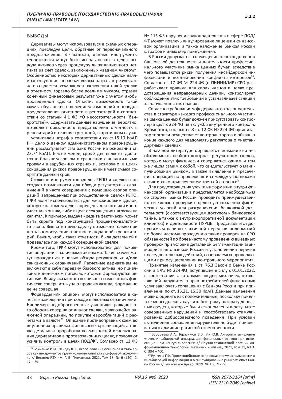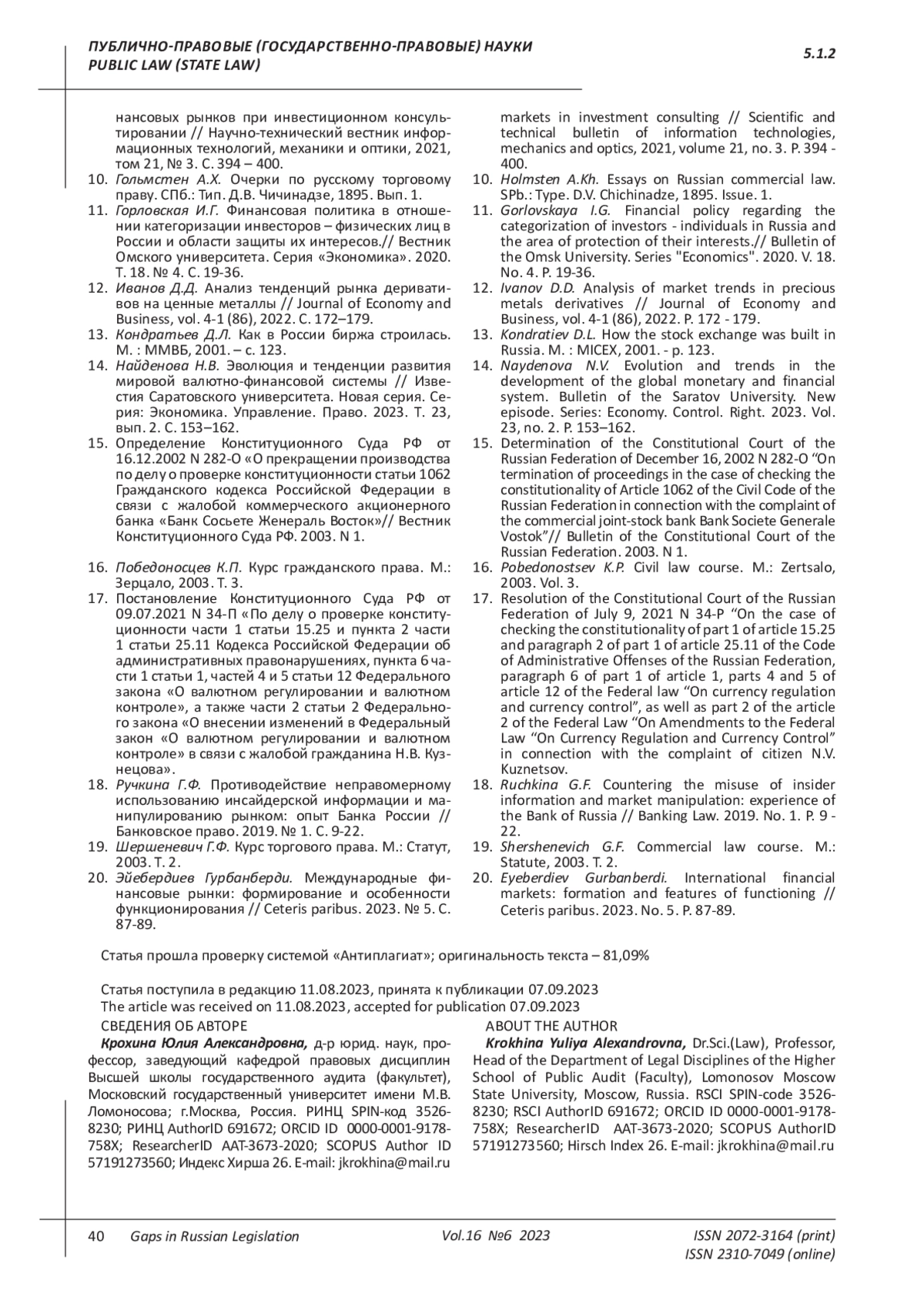 18. 	Ручкина Г.Ф. Противодействие неправомерному использованию инсайдерской информации и манипулированию рынком: опыт Банка России // Банковское право. 2019. № 1. С. 9-22. EDN: YVAXLN
