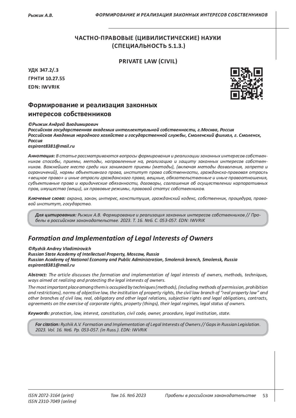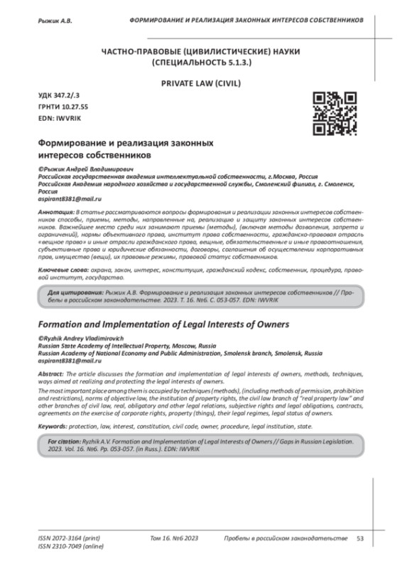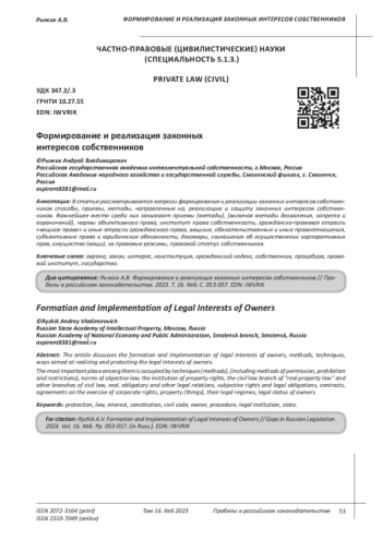 В статье рассматриваются вопросы формирования и реализации законных интересов собственников способы, приемы, методы, направленные на, реализацию и защиту законных интересов собственников. Важнейшее место среди них занимают приемы (методы), (включая методы дозволения, запрета и ограничений), нормы объективного права, институт права собственности, гражданско-правовая отрасль «вещное право» и иные отрасли гражданского права, вещные, обязательственные и иные правоотношения, субъективные права и юридические обязанности, договоры, соглашения об осуществлении корпоративных прав, имущество (вещи), их правовые режимы, правовой статус собственников.