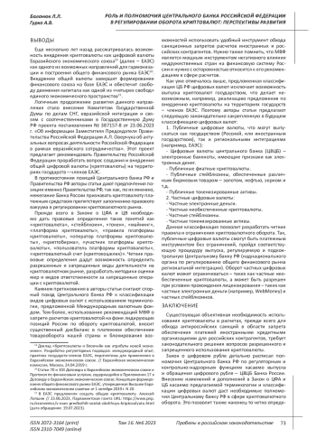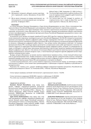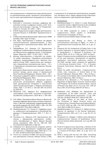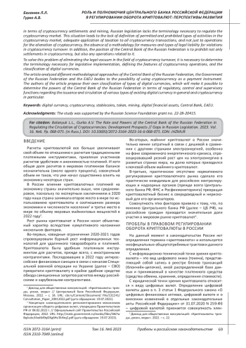11. О.В. Содель. Полномочия Банка России в области обращения цифровых финансовых активов и криптовалюты // Вестник Саратовской государственной юридической академии. № 4 (147). 2022, с. 208 - 213. DOI: 10.24412/2227-7315-2022-4-208-213