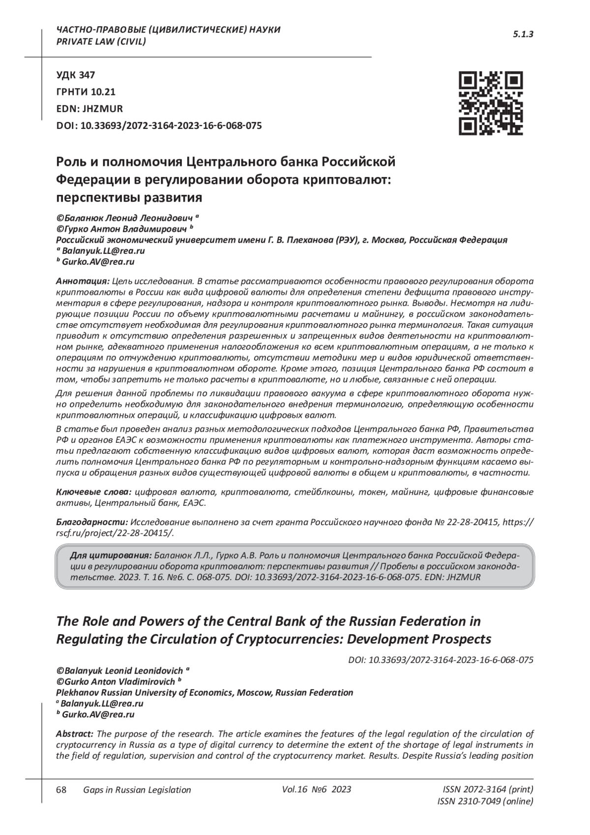 9. Курбанов Р.А., Баланюк Л.Л. Концепция законодательного регулирования оборота цифровых прав: доктринальные основания и перспективы практической реализации. // Журнал российского права. 2023. Т. 27. № 6. С. 116-129. DOI: 10.12737/jrp.2023.071 EDN: UVHHCP