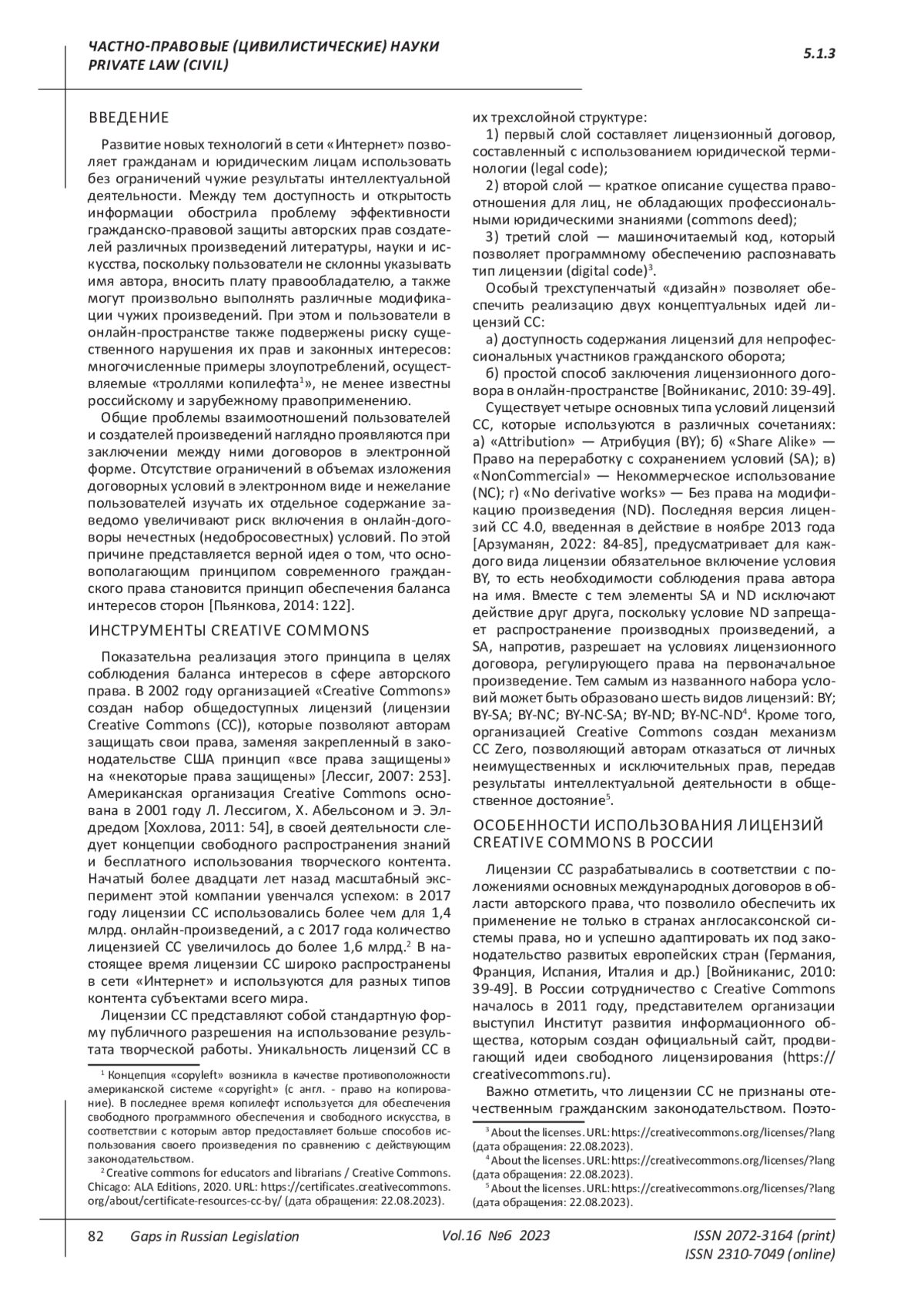 1. 	Арзуманян А.Б. Лицензии Creative Commons: история появления и использование в России и за рубежом // Вестник юридического факультета Южного федерального университета. 2022. № 4. С. 84-89. EDN: CTVVWF