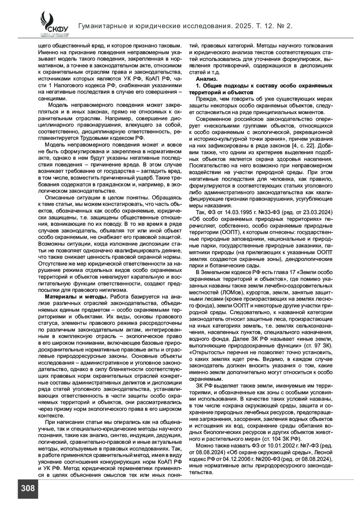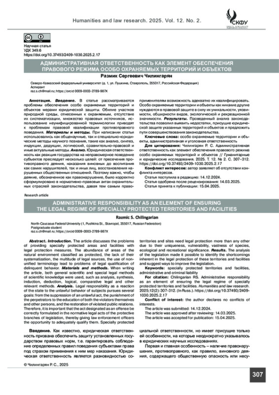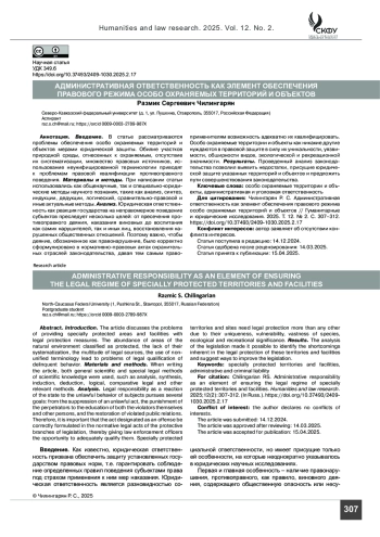 Введение. В статье рассматриваются проблемы обеспечения особо охраняемых территорий и объектов мерами юридической защиты. Обилие участков природной среды, отнесенных к охраняемым, отсутствие их систематизации, множество правовых источников, использование неунифицированной терминологии приводят к проблемам правовой квалификации противоправного поведения.