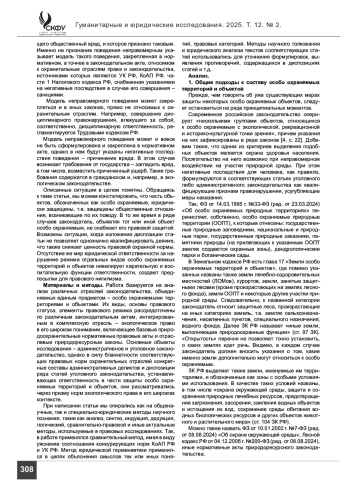 Анализ. Юридическая ответственность как реакция государства на неправомерное поведение субъектов преследует несколько целей: от пресечения противоправного деяния, наказания виновных до воспитания как самих нарушителей, так и иных лиц, восстановления нарушенных общественных отношений. Поэтому важно, чтобы деяние, обозначенное как правонарушение, было корректно сформулировано в нормативно-правовых актах охранительных отраслей законодательства, давая тем самым право применителям возможность адекватно их квалифицировать. Особо охраняемые территории и объекты как никакие другие нуждаются в правовой защите в силу их уникальности, уязвимости, обширности видов, экологической и рекреационной значимости.