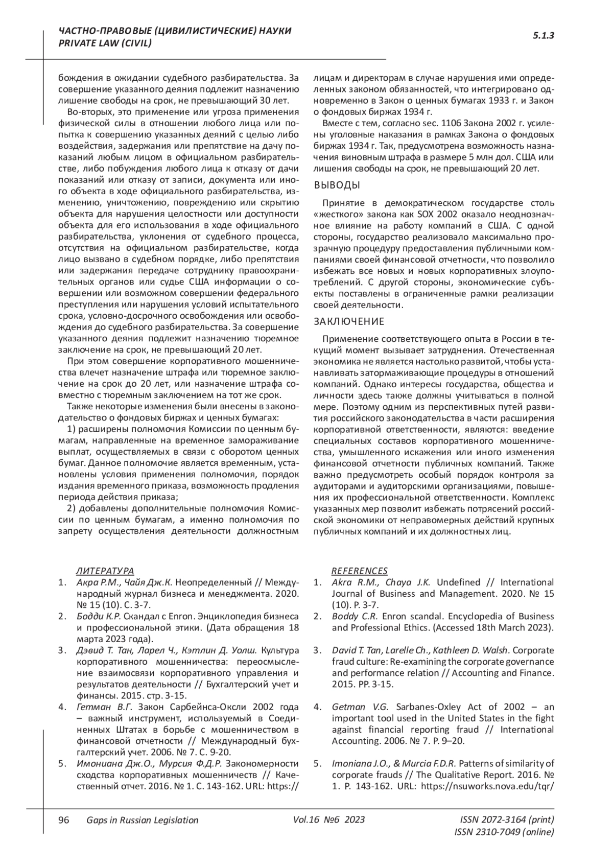 4. 	Гетман В.Г. Закон Сарбейнса-Оксли 2002 года - важный инструмент, используемый в Соединенных Штатах в борьбе с мошенничеством в финансовой отчетности // Международный бухгалтерский учет. 2006. № 7. С. 9-20. EDN: HSQJOF