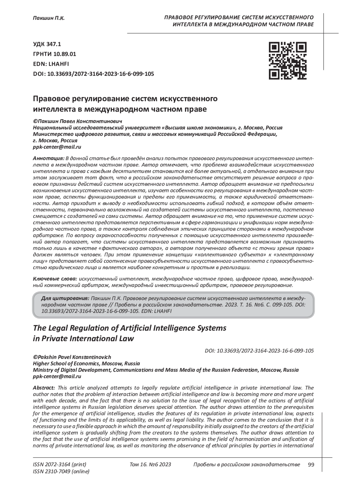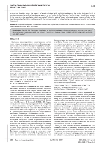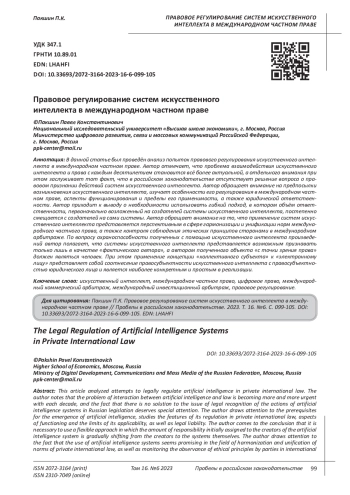 В данной статье был проведён анализ попыток правового регулирования искусственного интеллекта в международном частном праве. Автор отмечает, что проблема взаимодействия искусственного интеллекта и права с каждым десятилетием становится всё более актуальной, а отдельного внимания при этом заслуживает тот факт, что в российском законодательстве отсутствует решение вопроса о правовом признании действий систем искусственного интеллекта. Автор обращает внимание на предпосылки возникновения искусственного интеллекта, изучает особенности его регулирования в международном частном праве, аспекты функционирования и пределы его применимости, а также юридической ответственности. Автор приходит к выводу о необходимости использовать гибкий подход, в котором объём ответственности, первоначально возложенный на создателей системы искусственного интеллекта, постепенно смещается с создателей на сами системы. Автор обращает внимание на то, что применение систем искусственного интеллекта представляется перспективным в сфере гармонизации и унификации норм международного частного права, а также контроля соблюдения этических принципов сторонами в международном арбитраже. По вопросу охраноспособности полученных с помощью искусственного интеллекта произведений автор полагает, что системы искусственного интеллекта представляется возможным признавать только лишь в качестве «фактического автора», а автором полученного объекта «с точки зрения права» должен являться человек. При этом применение концепции «коллективного субъекта» к «электронному лицу» представляет собой соотнесение правосубъектности искусственного интеллекта с правосубъектностью юридического лица и является наиболее конкретным и простым в реализации.