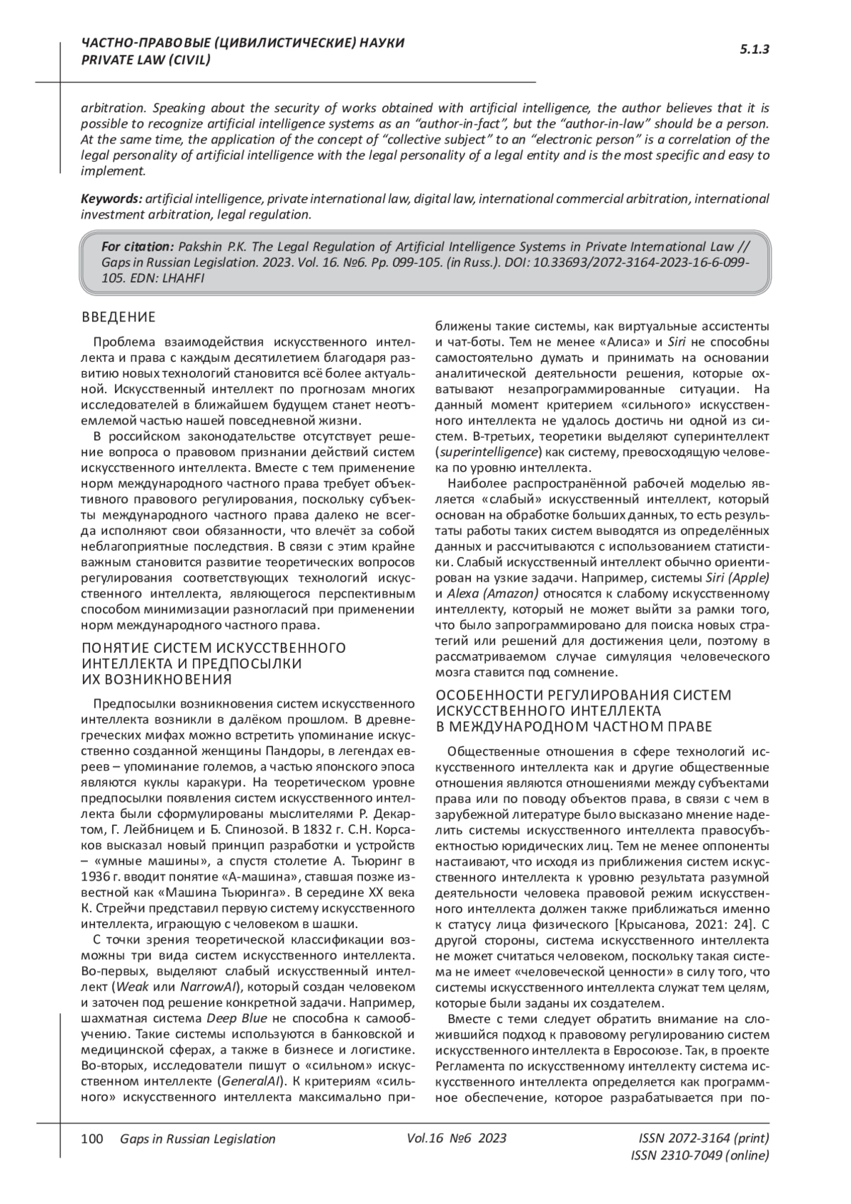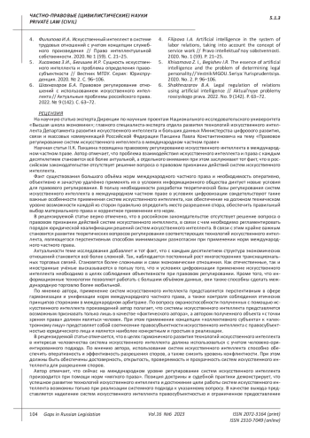 5. 	Хисамова З.И., Бегишев И.Р. Сущность искусственного интеллекта и проблема определения правосубъектности // Вестник МГОУ. Серия: Юриспруденция. 2020. № 2. С. 96-106. EDN: IAIDFV